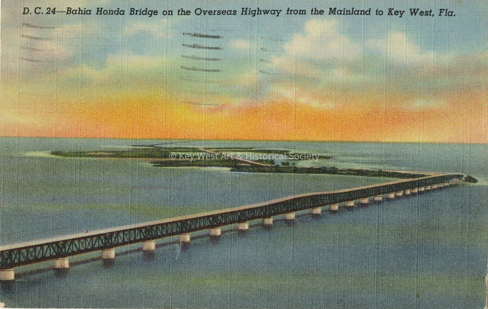 Postcard depicting Bahia Honda Bridge on the Overseas Highway from the Mainland to Key West, Fla. The Overseas Highway to Key West, Fla. the southernmost city in the U.S. is one of the greatest engineering wonders in the world. Crossing Bahia Honda bridge is the most spectacular part on this great highway, where the road rises 70 ft. above the meeting of the Atlantic Ocean and the Gulf of Mexico.Collection