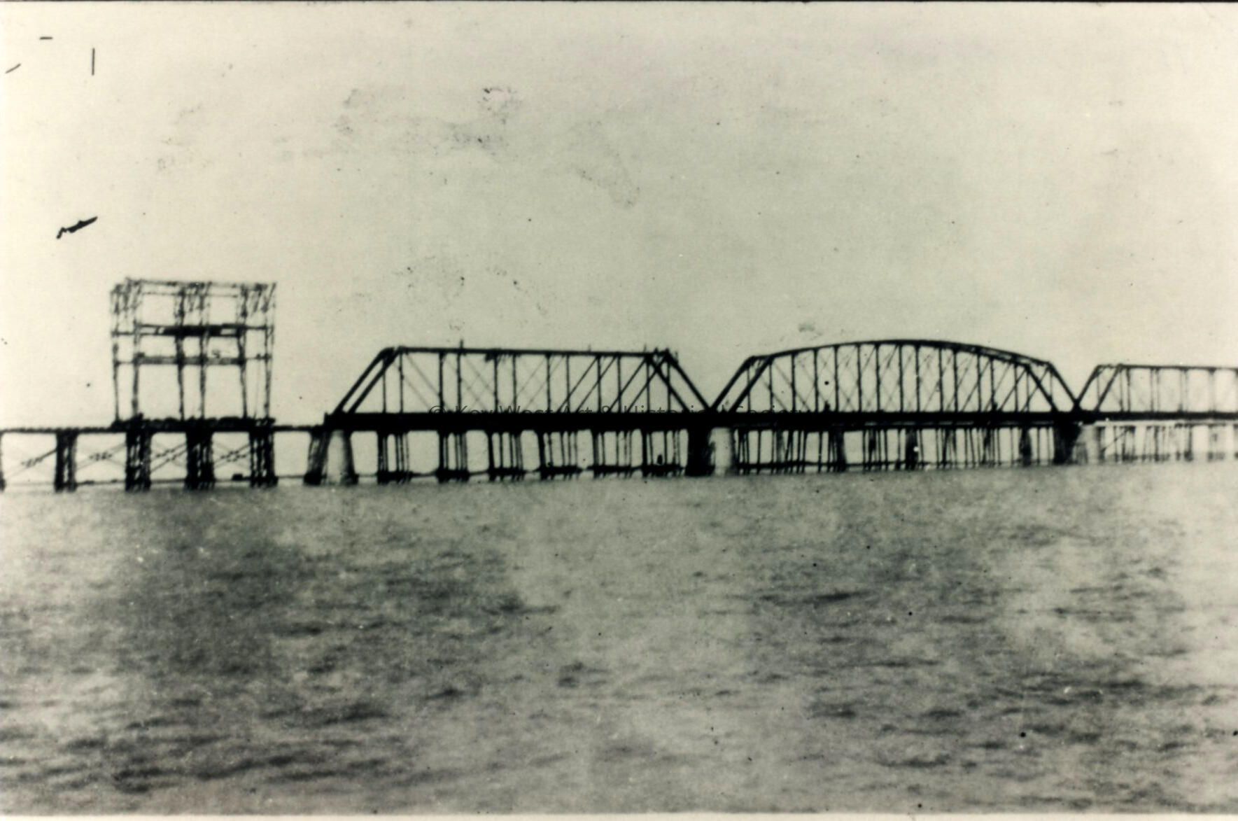 Black and white photograph of the steel truss Bahia Honda Bridge under construction.