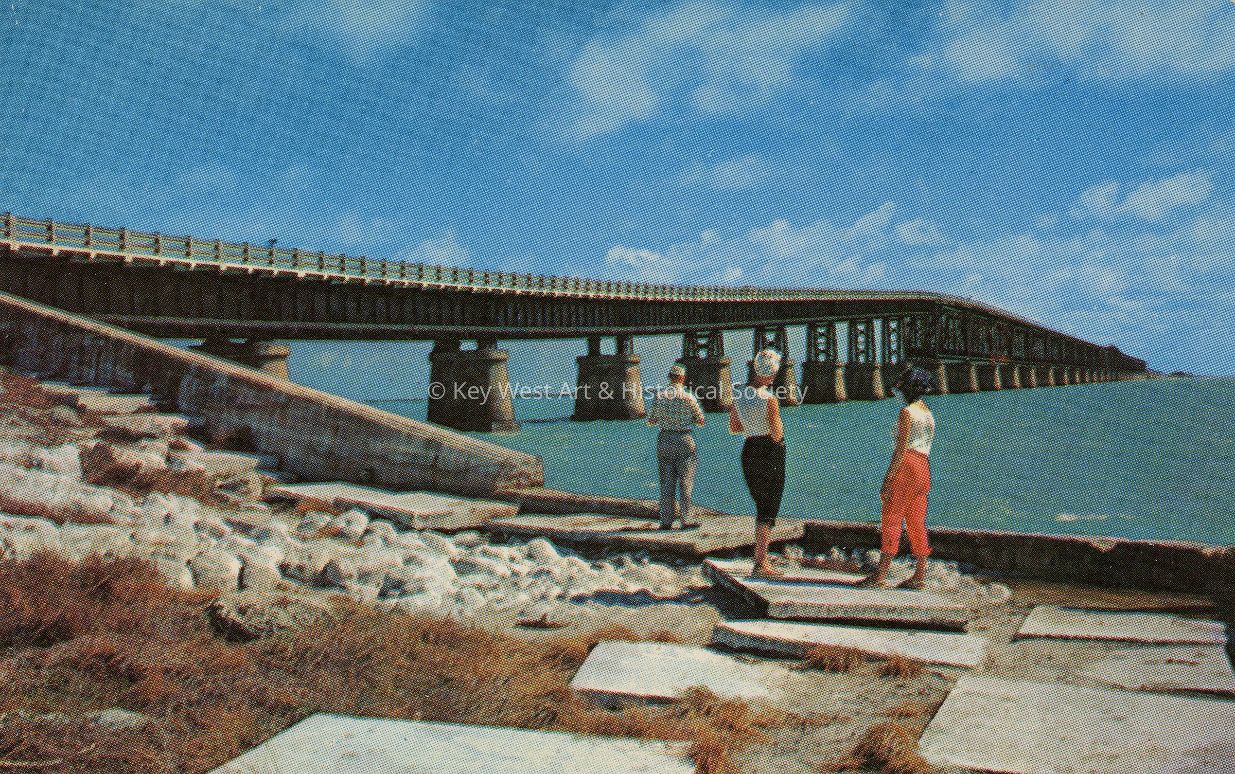 Postcard of the Bahia Honda Bridge on the Overseas Highway. Caption on verso reads, 'The most spectacular span of the Oversea Highway to Key West, Fla. Regarded as one of the engineering wonders of all time - this great highway rises 70 feet at this location - over the blending waters of the Atlantic Ocean and the Gulf of Mexico.'Subject Place
