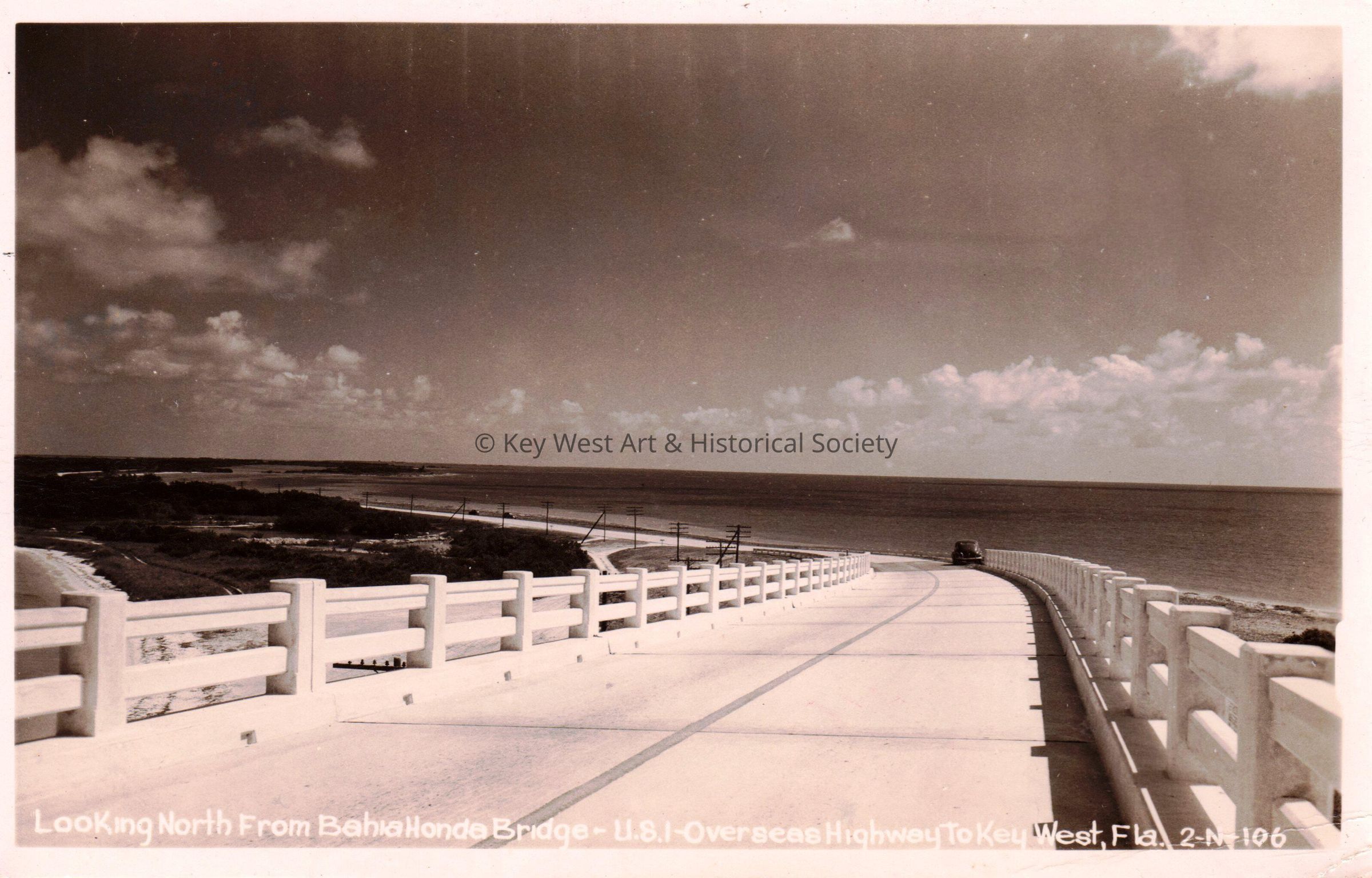 Postcard depicting a black and white photo from atop Bahia Honda Bridge. The caption reads, ‘Looking north from Bahia Honda Bridge - U.S. 1 - Overseas Highway to Key West, Florida’.Collection