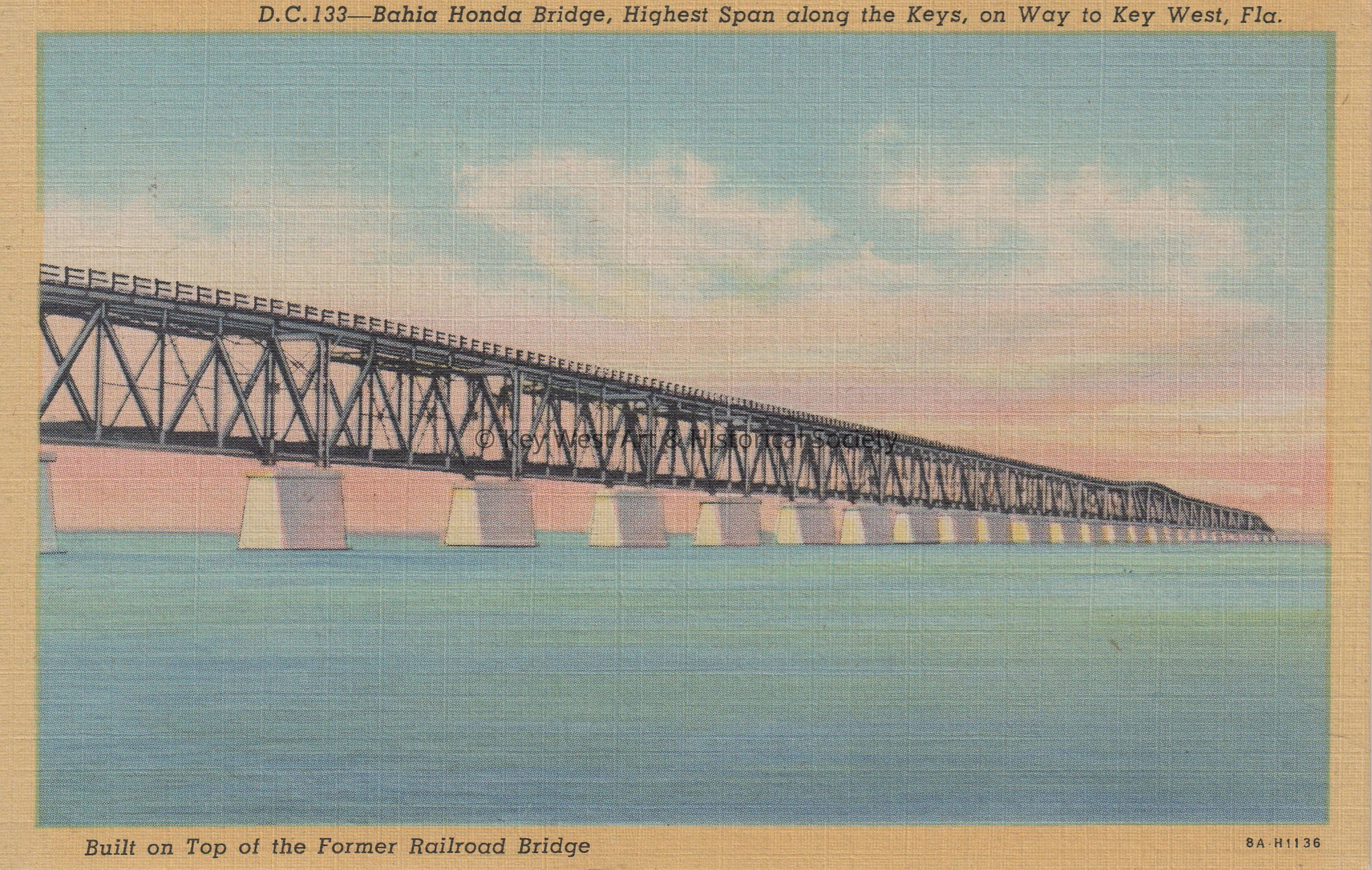 Postcard of a steel bridge. The caption reads, ‘Bahia Honda Bridge, Highest Span along the Keys, on Way to Key West, Florida. Built on top of the former railroad bridge.’Subject Place