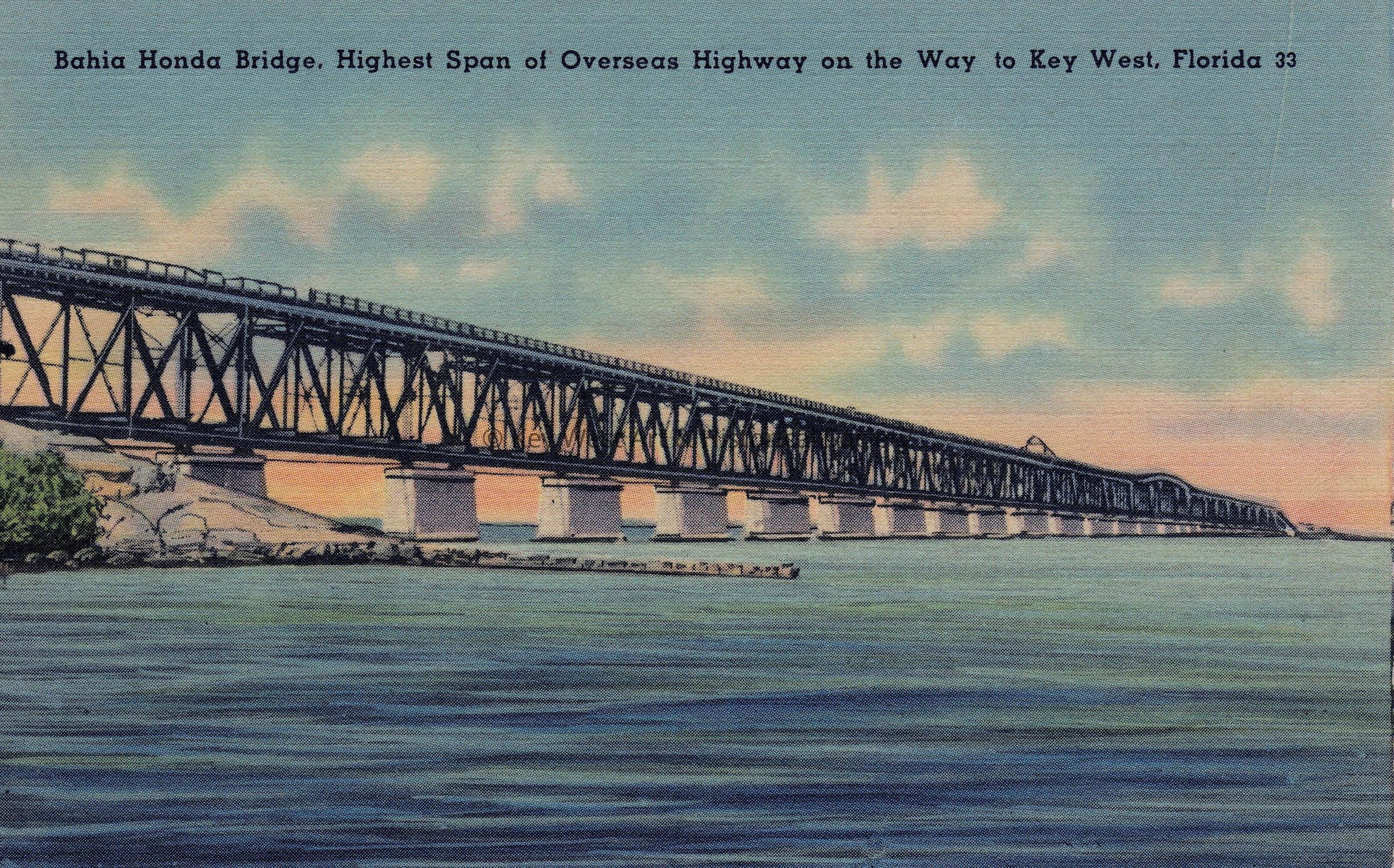 Postcard depicting the Bahia Honda Bridge. The caption reads, ‘Bahia Honda Bridge, highest span of Overseas Highway on the way to Key West, Florida’. The description on the verso reads, 'This Bridge is one of the connecting links in that modern engineering marvel the Overseas Highway, which joins Key West to the mainland.'Collection