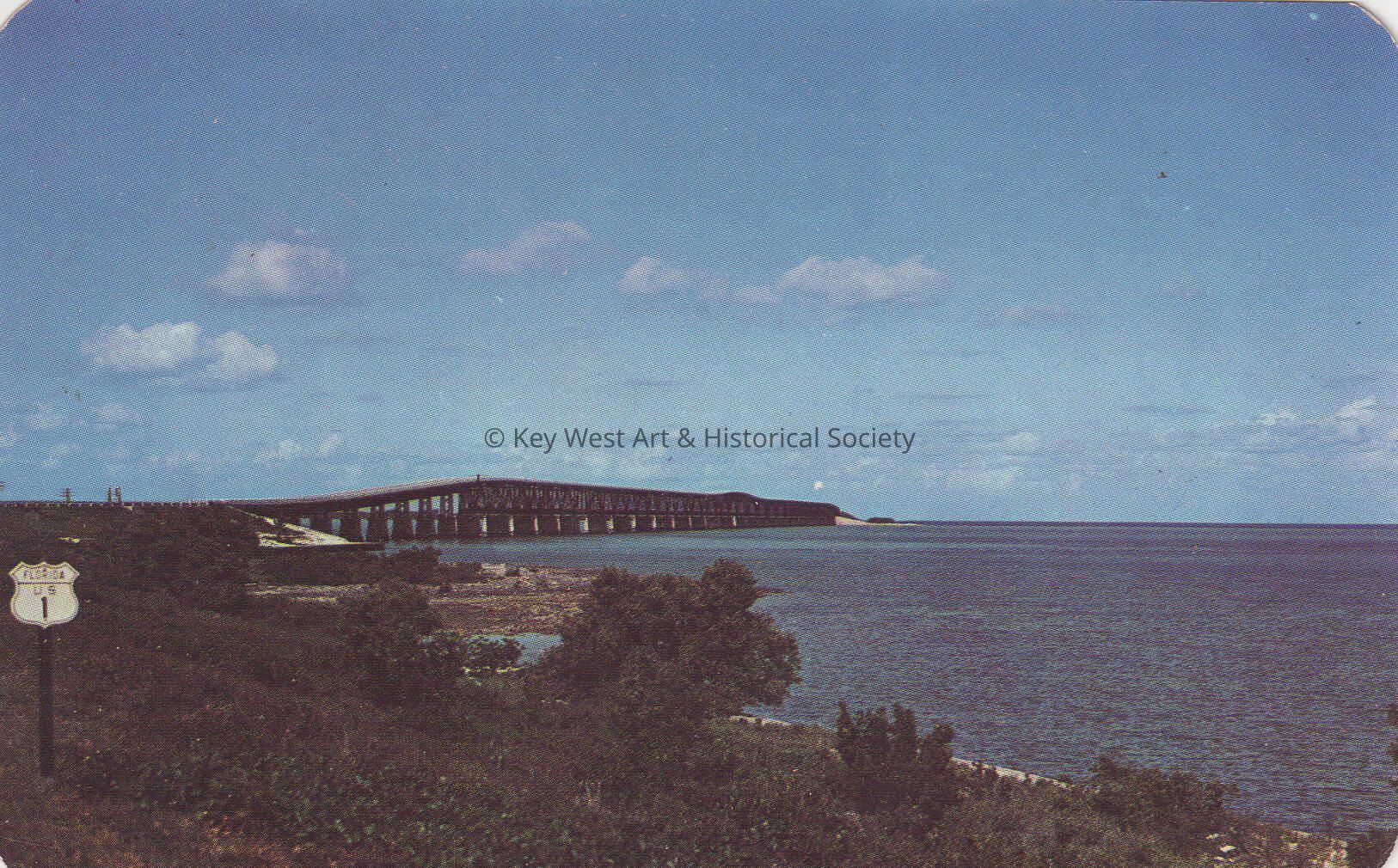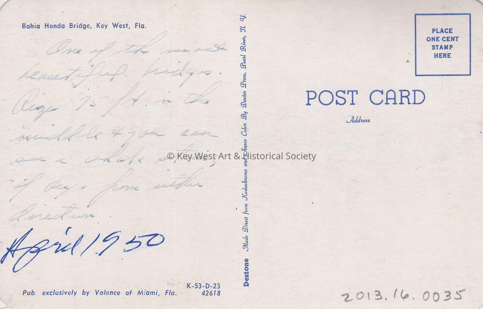 Postcard depicting a bridge. The description on the verso reads, 'Bahia Honda Bridge, Key West, Florida.' The message on the verso reads, 'One of the most beautiful bridges. Rises 75 feet in the middle and you can see a whole string of keys from either direction. April, 1950'.Subject Place