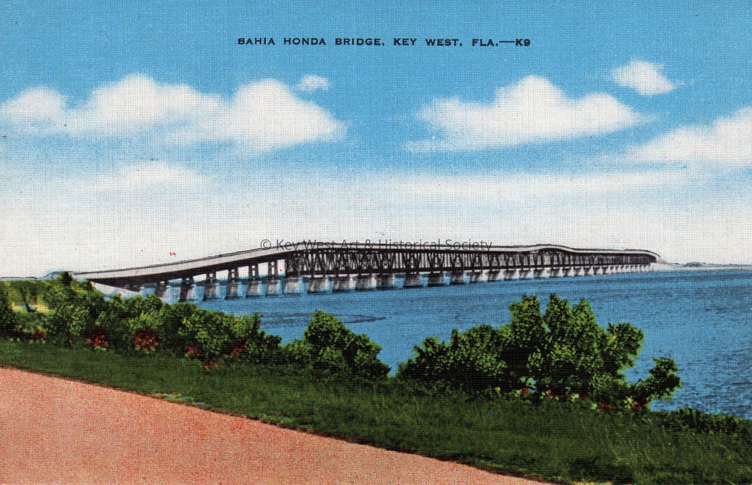Postcard depicting the Bahia Honda Bridge. The description on the verso reads, 'All bridges on the Overseas Highway are of solid steel and of concrete construction. Here the motorist goes to sea by automobile.'Subject Place