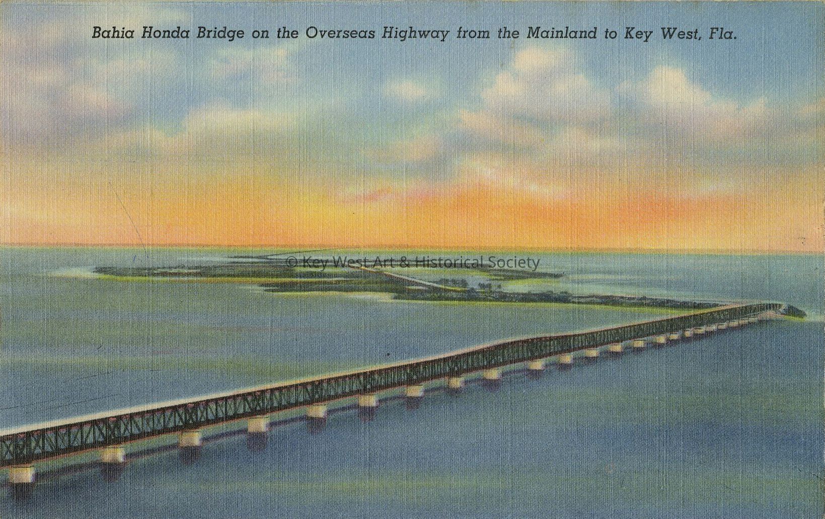 Postcard of Bahia Honda Bridge on the Overseas Highway from the mainland to Key West, Florida. The Overseas Highway to Key West, Fla. the southernmost city in the U.S. is one of the greatest engineering wonders in the world. Crossing Bahia Honda bridge is the most spectacular part on this great highway, where the road rises 70 ft. above the meeting of the Atlantic Ocean and the Gulf of Mexico.Collection