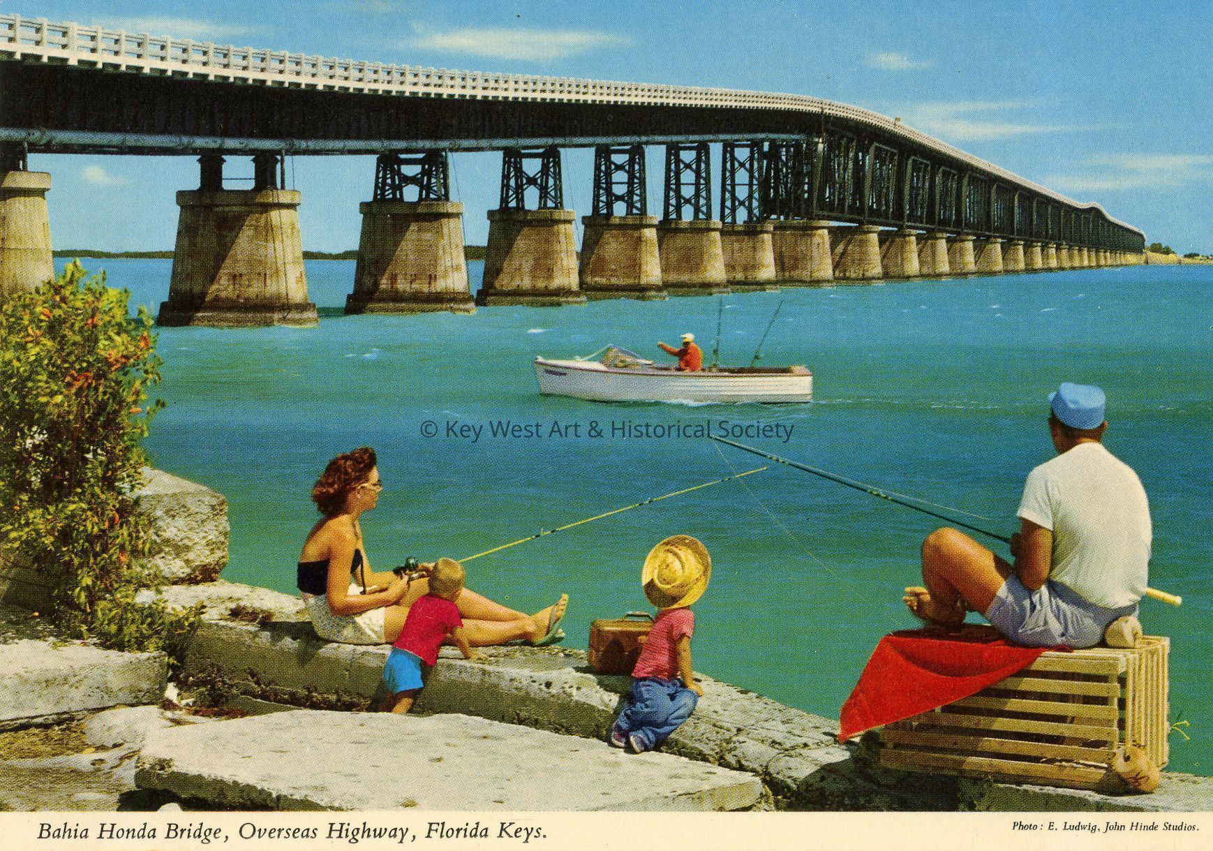 Postcard of a family fishing near the old Bahia Honda Bridge. Notation on verso, 'Bahia Honda, this majestic span in the Overseas Highway system is the highest of the forty bridges that comprise the Overseas Highway. From the Florida mainland to the westernmost key and the southernmost point of land in the continental U.S., this Highway has bridged over water for a distance of 18 miles. On one side is the Atlantic Ocean and on the other is the Gulf of Mexico.'Subject Place