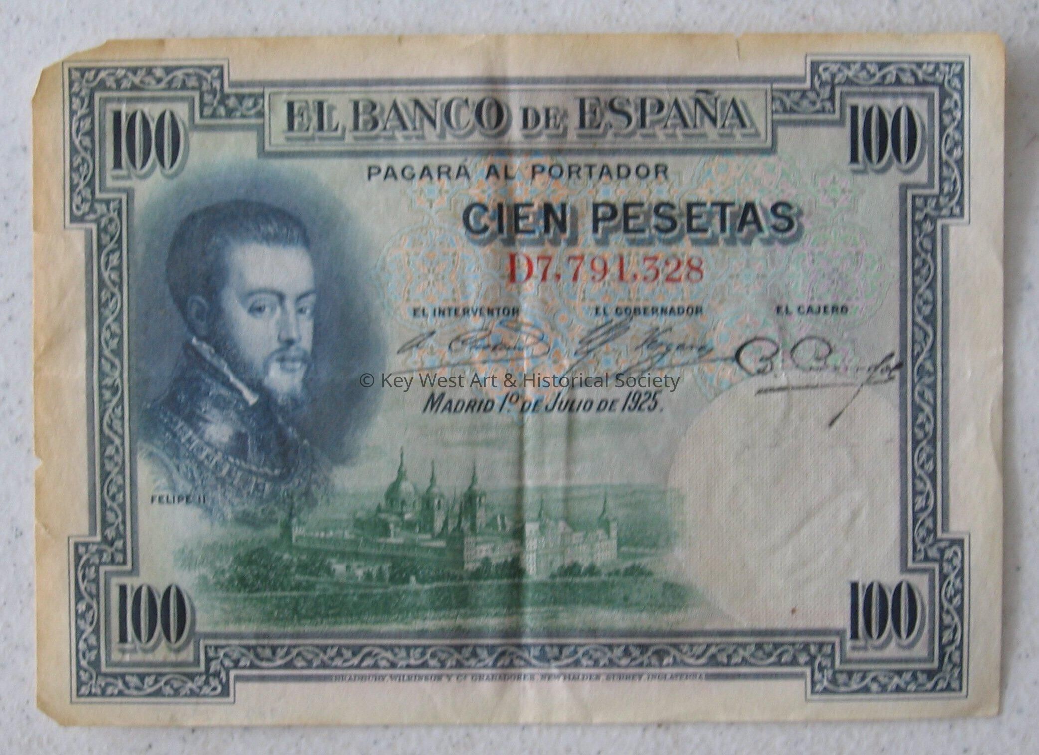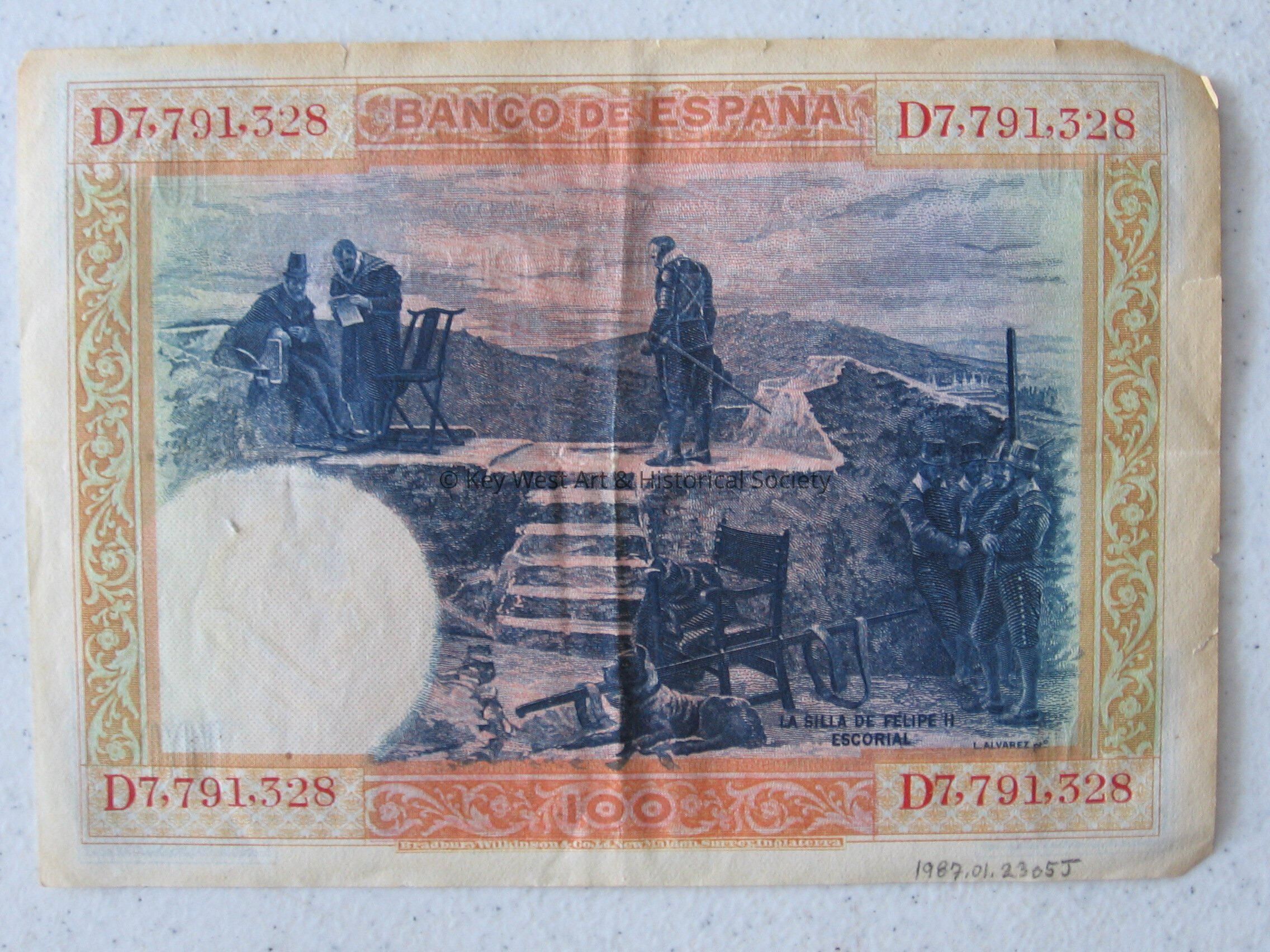 100 Peseta note from 1925. Green and blue front; blue and red/orange back. Picture of Felipe II on front along with a picture of a castle. On back is a picture of men standing on a platform. Engraved in England. From Wallet.Collection