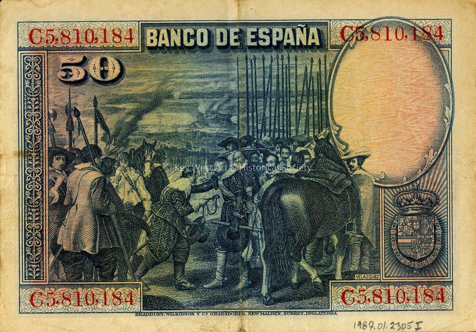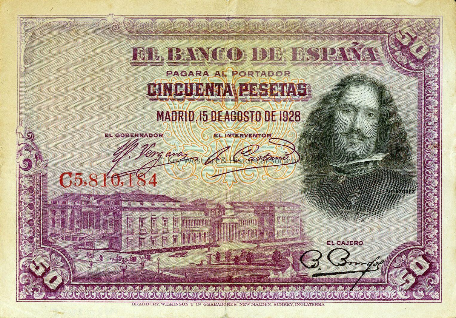 Banco de Espana issued 50 Peseta note dated 1928, held by Ernest Hemingway. The Spanish currency has a picture of Diego Velazquez and Madrid's Prado Museum on front. From the contents of Hemingway's wallet.Collection