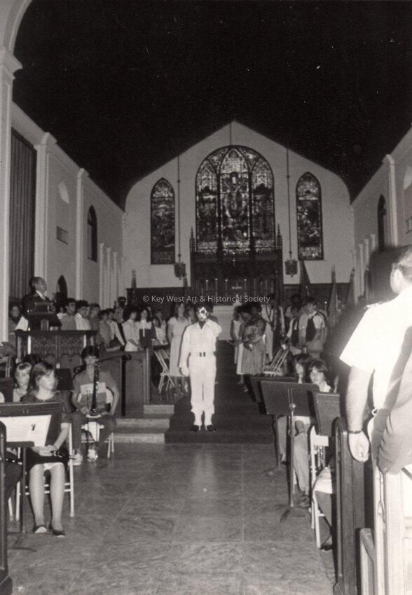 Band and crowd in a church.