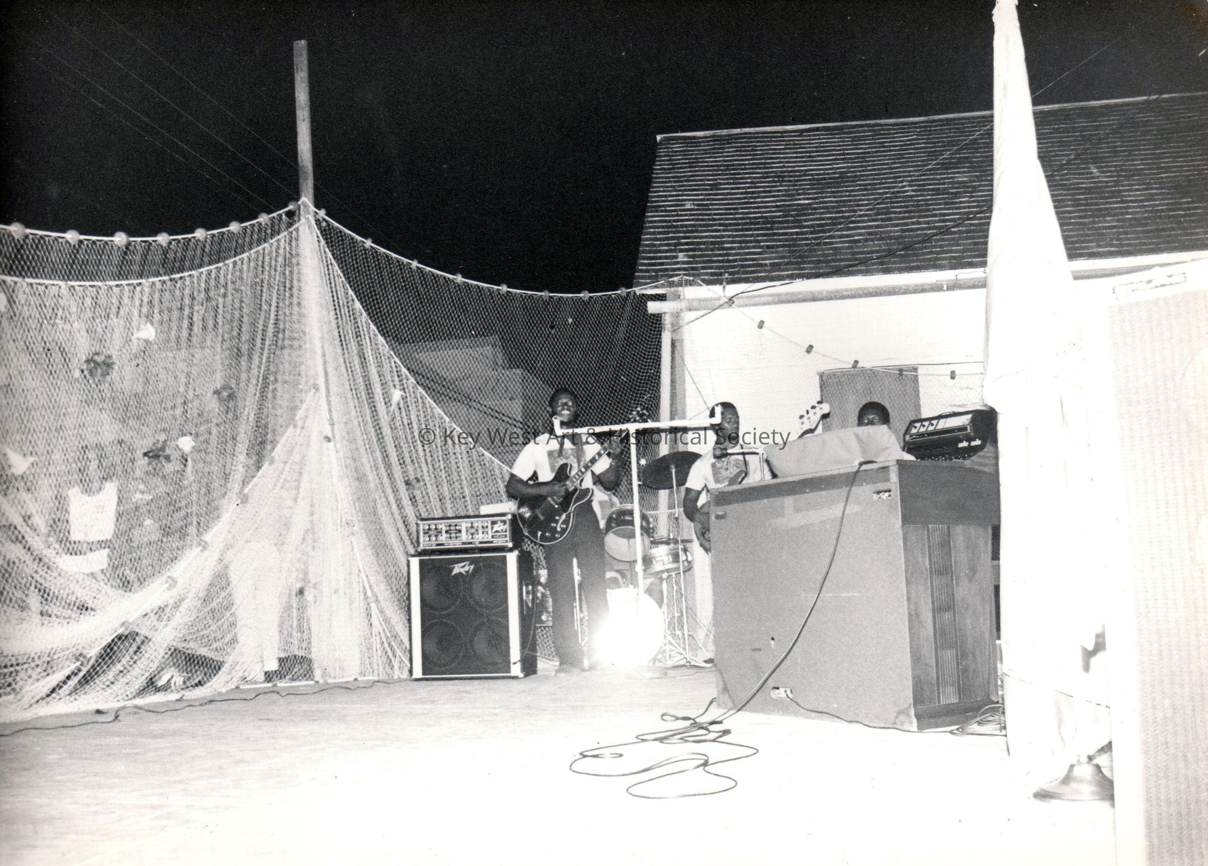 Black and white photograph of a band playing outdoors in Green Turtle Cay.