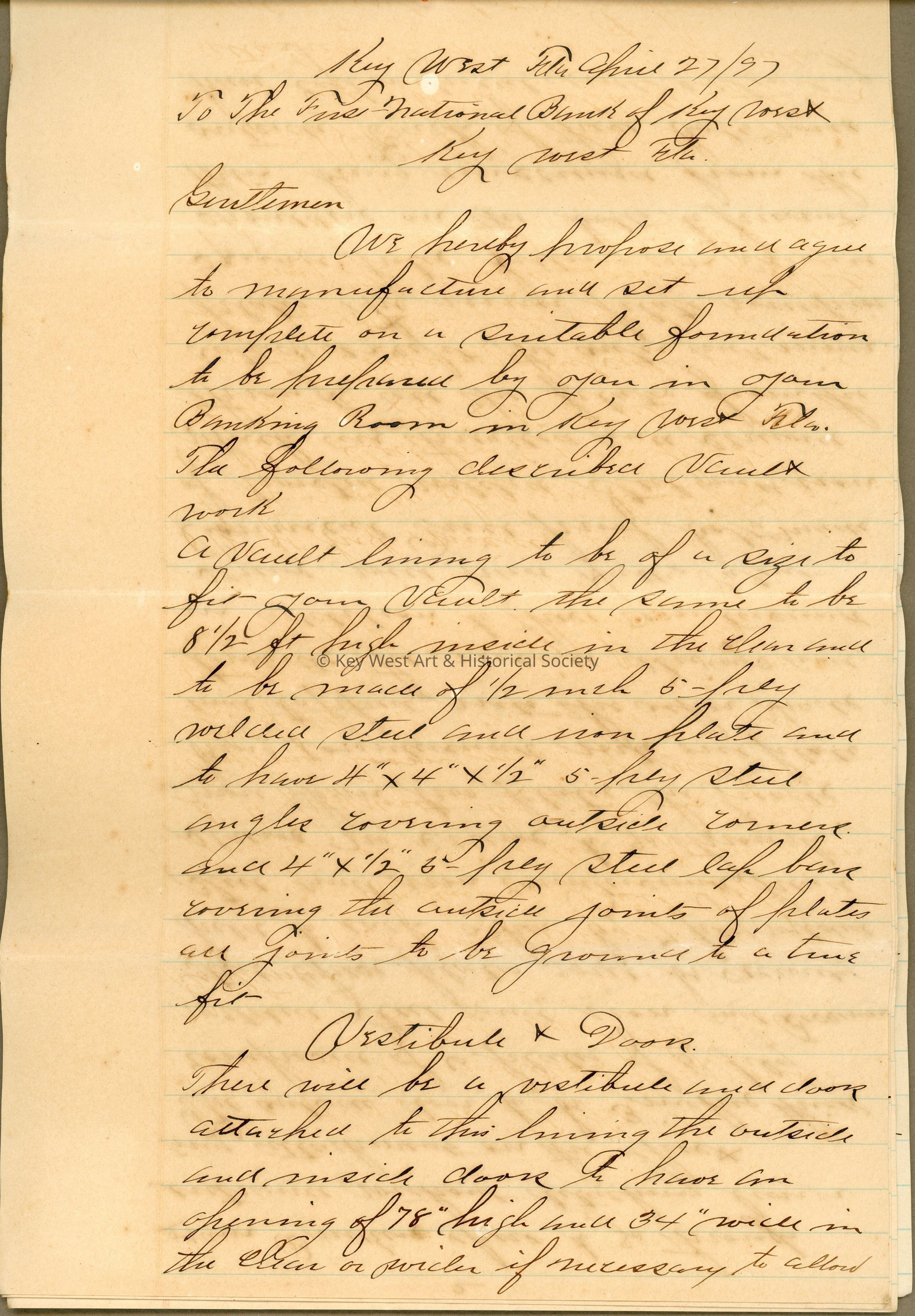 Letter dictating a proposal and specifications for a vault at The First National Bank of Key West, formerly located at 420 Front Street. The proposal is dated April 27, 1897. The letter was placed on board and used in a display in Wachovia Bank (at the same location).Collection