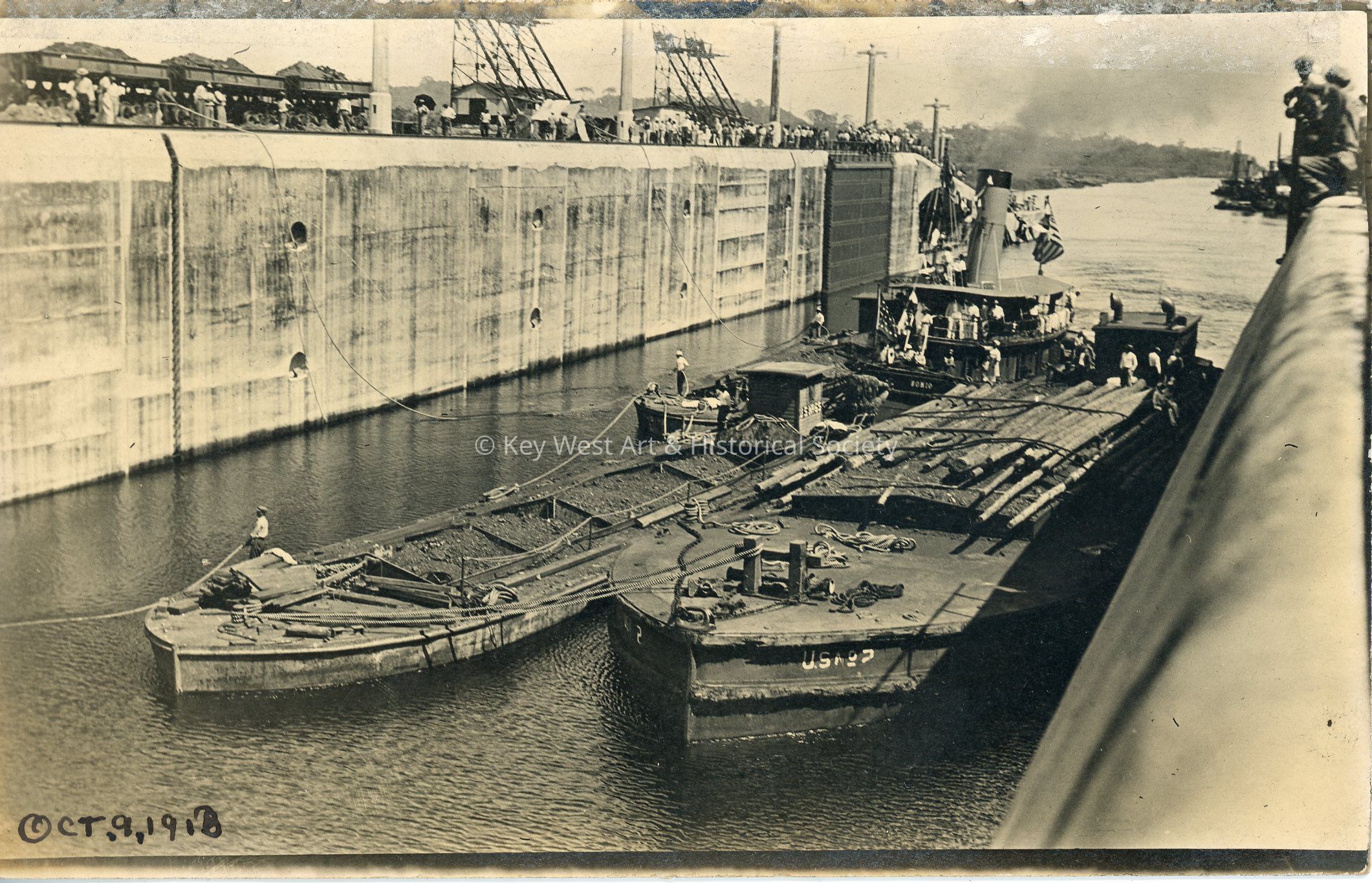 Black and white photograph postcard depicting multiple boats moving through the locks of what is likely the Gatun Locks. The photograph shows many people watching from the lock walls. The photograph was dated October 9, 1913.Subject