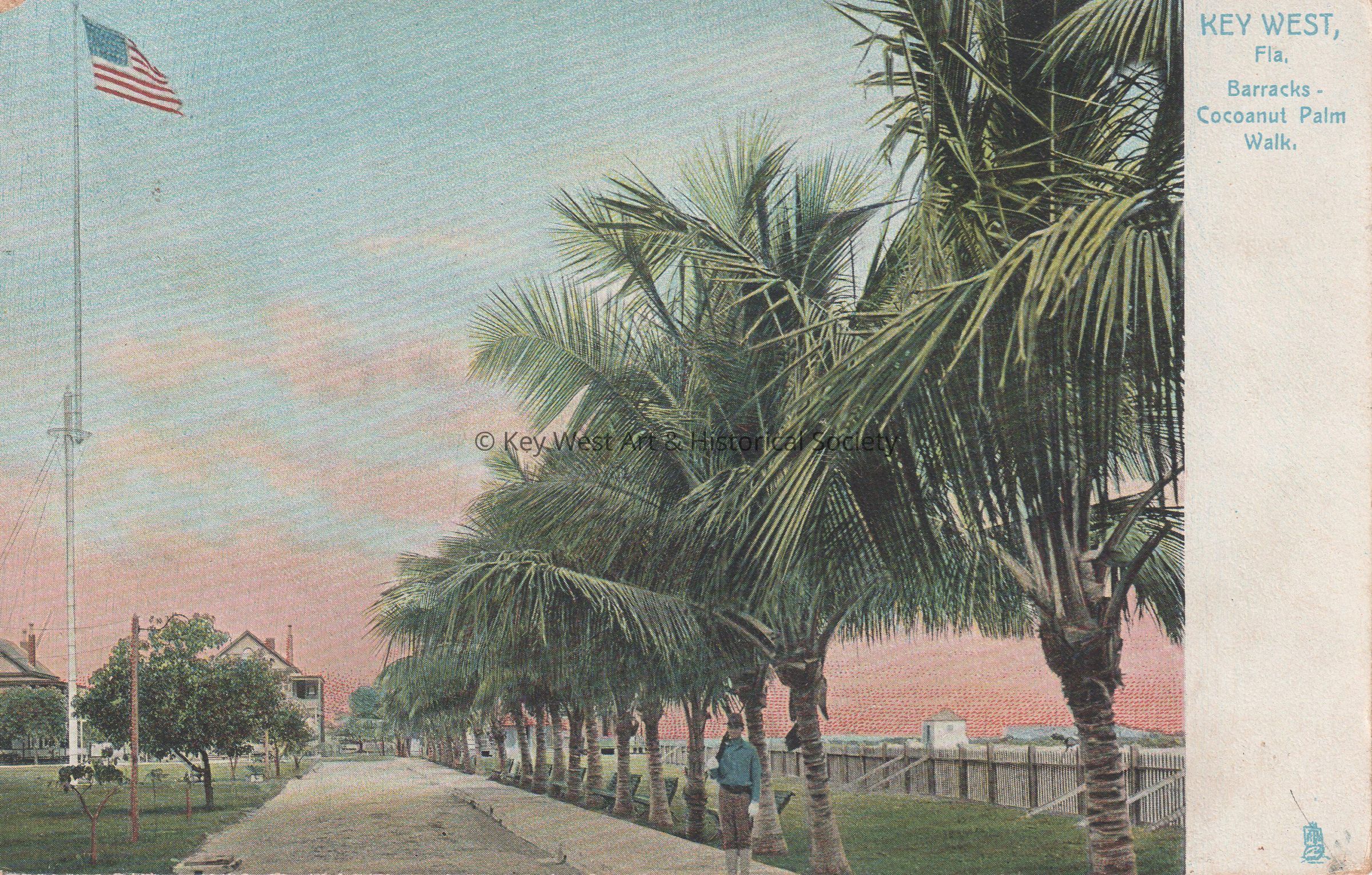 Postcard depicting a U.S. Army soldier on the road at the Army Barracks (present-day Peary Court). The caption reads, ‘Barracks – Cocoanut Palm Walk, Key West, Florida.’ Note on verso reads, ‘The U.S. Barracks at Key West, on U.S. Reservation, in the eastern part of the city, are noted for the beautiful cocoanut palm walk on the north side of the parade. The trees are from 25 to 30 feet high, and are from eight to ten years old. The first building of the Barracks, the Guard House, was erected in 1832.’Subject Place