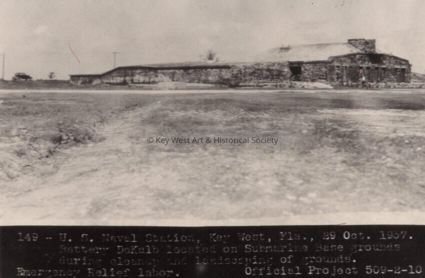 Black and white photograph of Battery De Kalb, located on the Submarine Base grounds, during cleanup and landscaping of grounds at Naval Station Key West and Fort Zachary Taylor.Collection