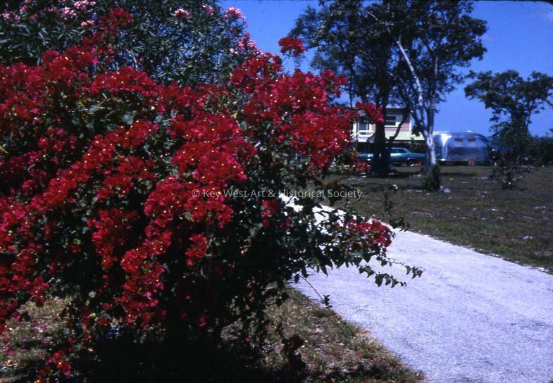 Color 35mm slide of the Baywood area of Key Largo with a bougainvillea bush in the foreground.