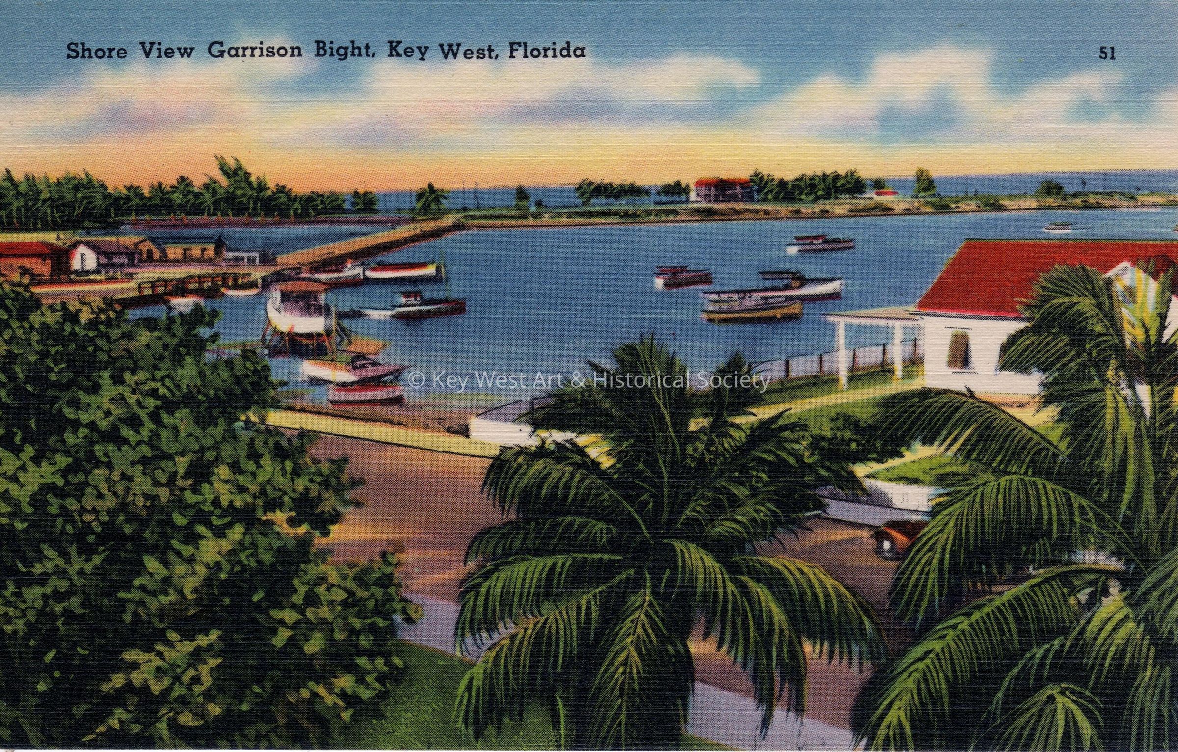 Postcard depicting boats at Garrison Bight. The caption reads, ‘Shore view Garrison Bight, Key West, Florida’. The description on the verso reads, 'Key West is a tiny tropical key on the coast of Florida lying between the Atlantic Ocean on the one side and the Gulf of Mexico on the other - it is the southernmost part of the United States.'Subject Place