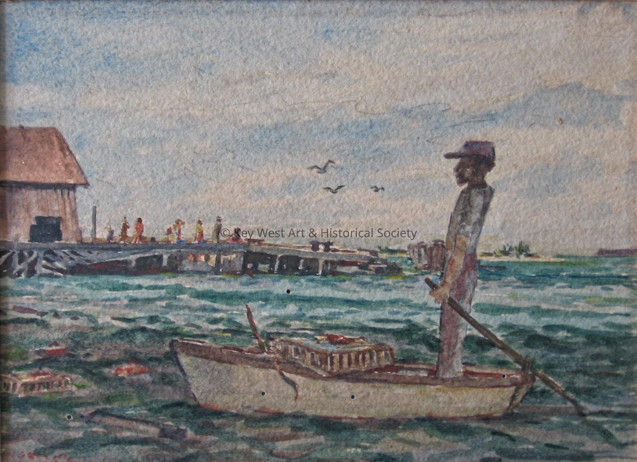 Watercolor by William Greene depicting a man standing in a dinghy navigating through a dockyard.  William Greene came to Key West in 1949. In January 1952, he held a series of lectures on art at the Fort East Martello Museum.Artwork Details