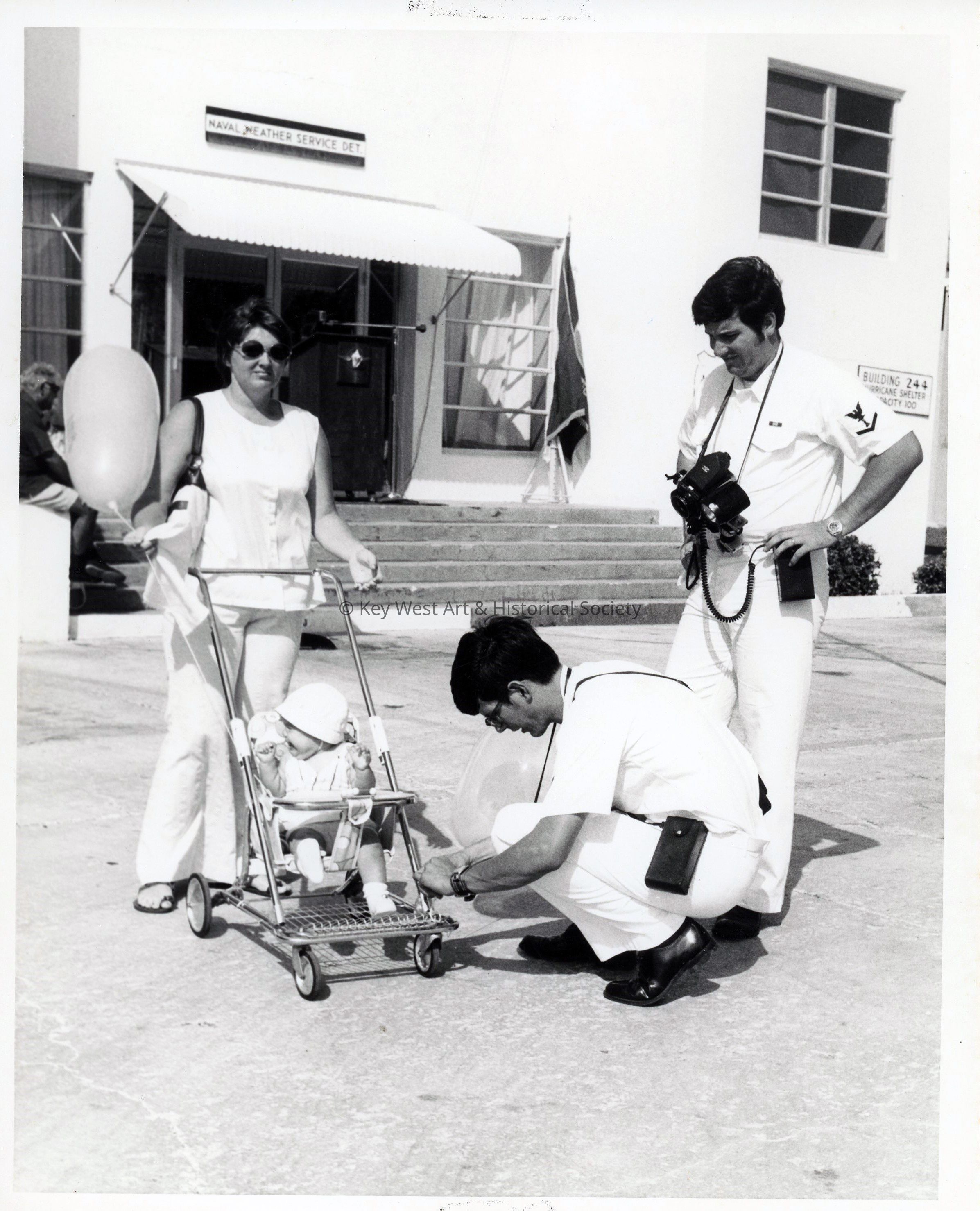 Black and white photograph of two US Navy sailors interacting with a woman and her baby in a stroller at Naval Station Key West in front of the Naval Weather Service Building, No. 244.
