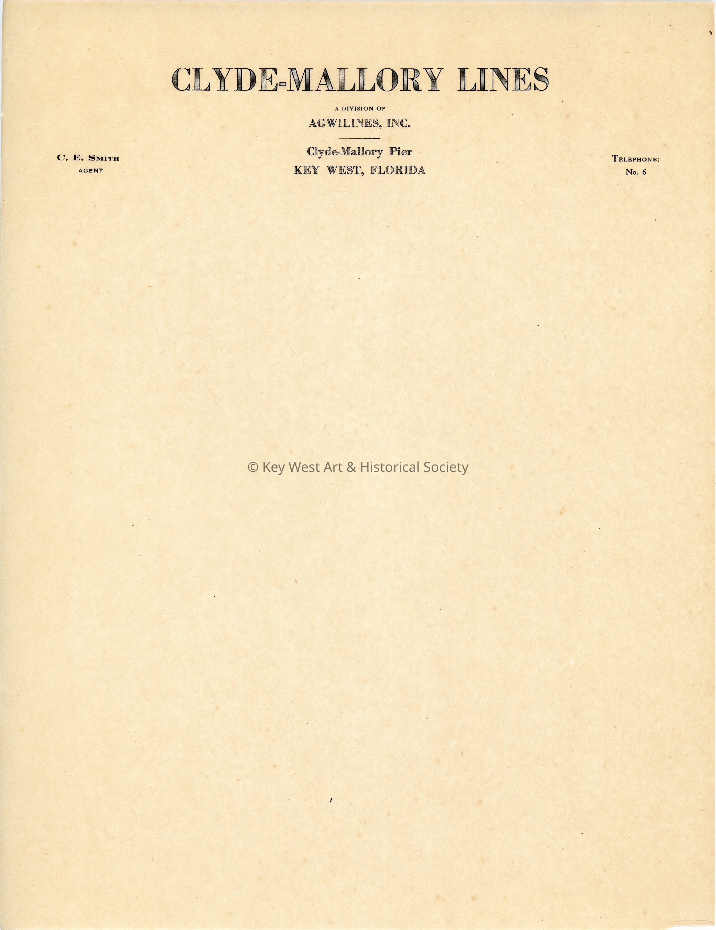 Stationery with Clyde-Mallory Steamship Lines letterhead. Used by Agent C. E. Smith.