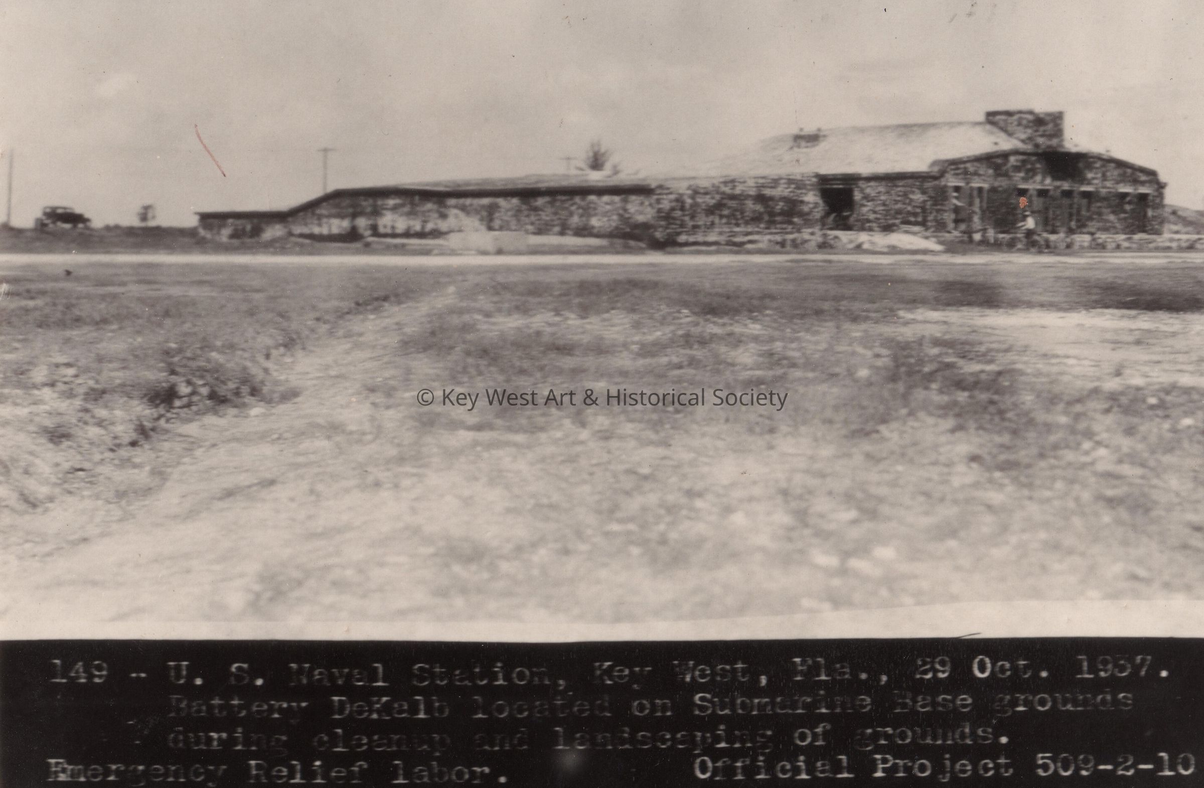 Black and white photograph of Battery De Kalb, located on the Submarine Base grounds, during cleanup and landscaping of grounds at Naval Station Key West and Fort Zachary Taylor.Collection