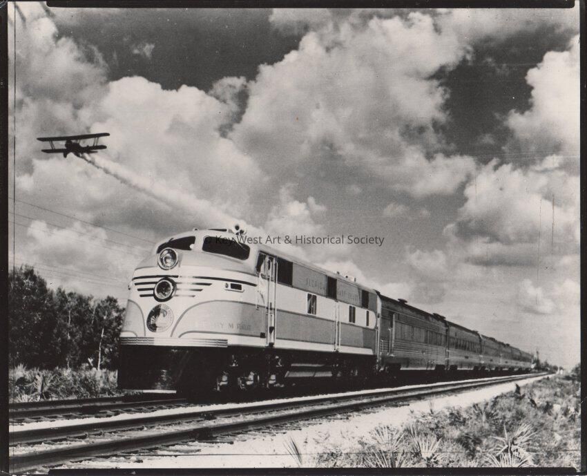 An airplane flying near a Florida East Coast trainEntry/Object ID