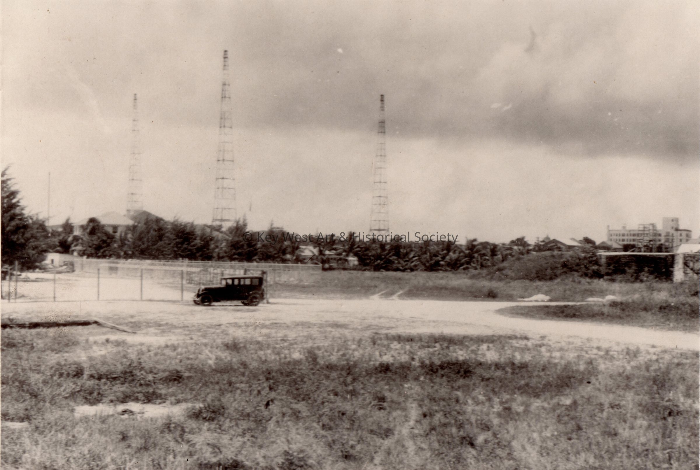 Black and white photograph of a car in front of the entrance to the submarine base at Naval Station Key West. The three towers belonging to the wireless station are visible in the background.