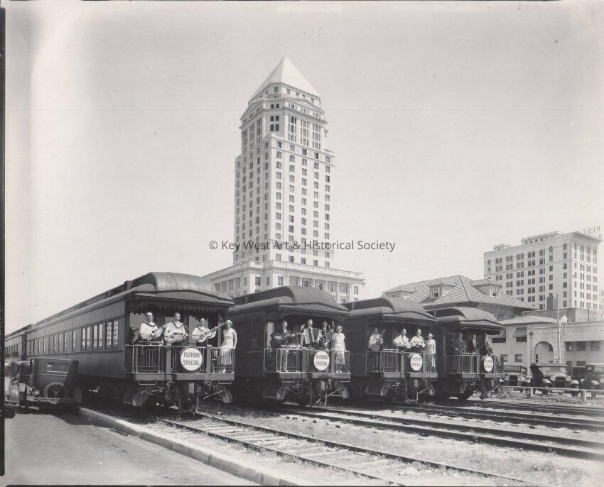 Musicians and passengers on Florida Special trains at the Miami East Coast Railroad passenger station.Collection