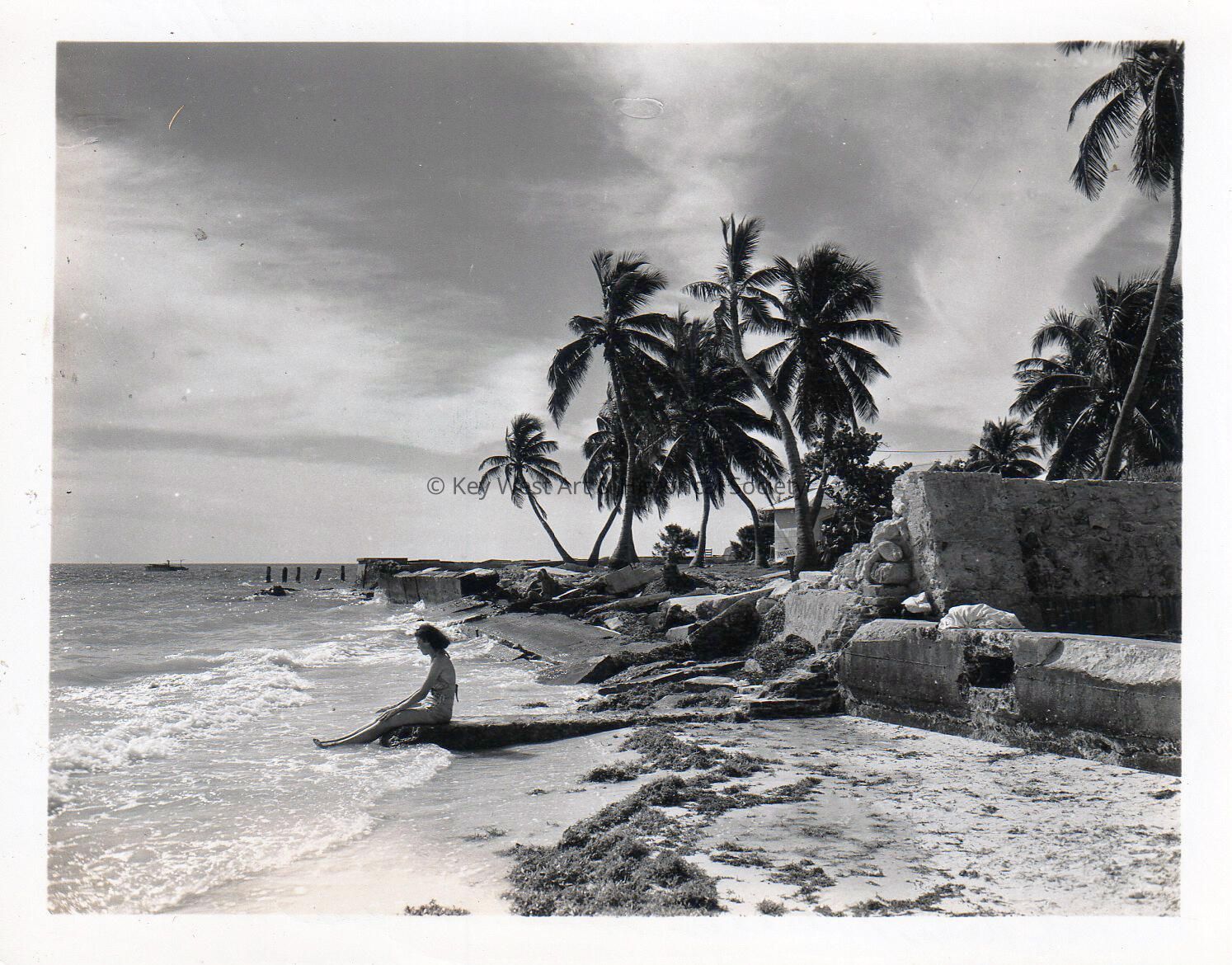 Black and white photograph of a woman sitting on the beach near the Southernmost House at the foot of Whitehead Street.