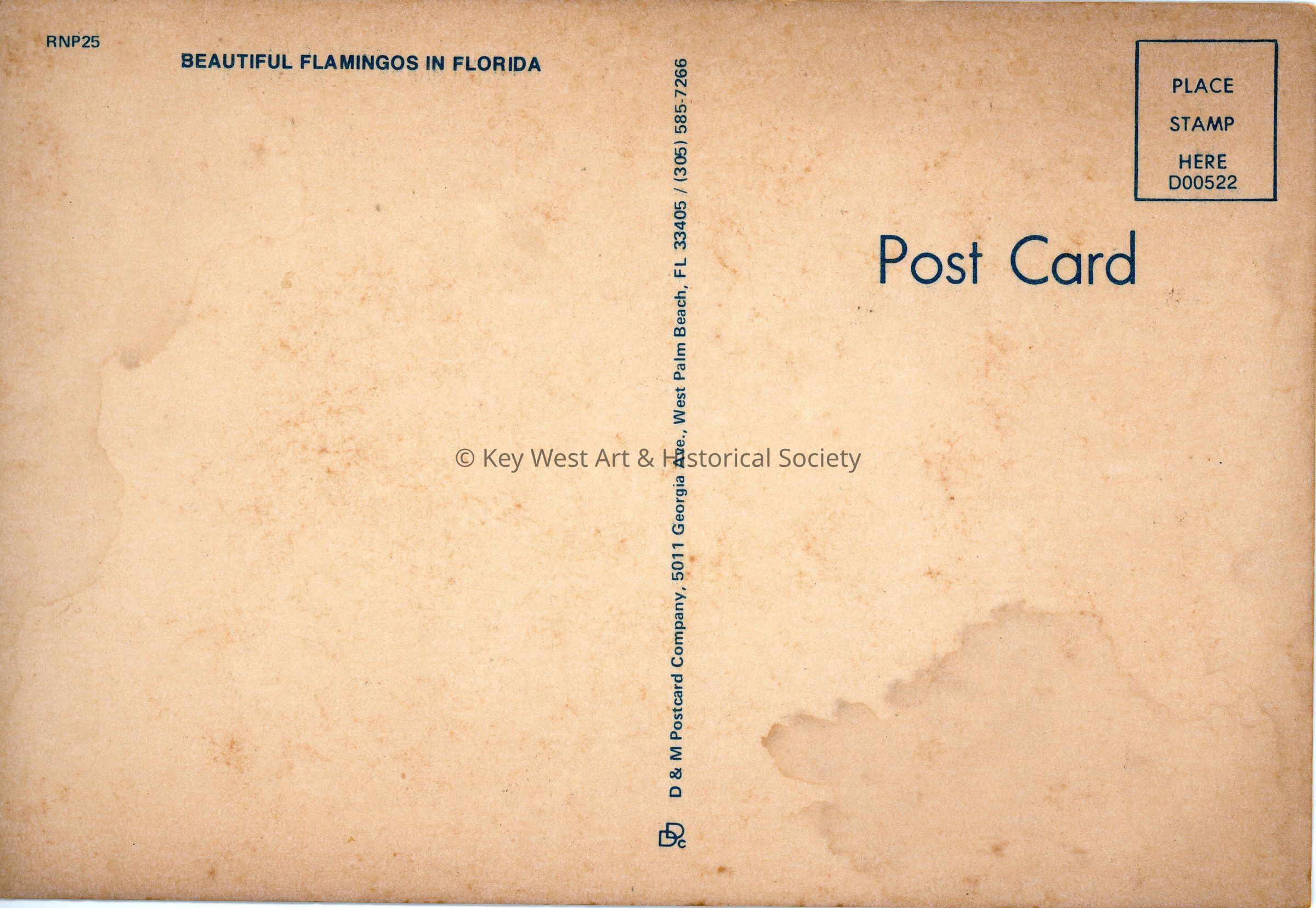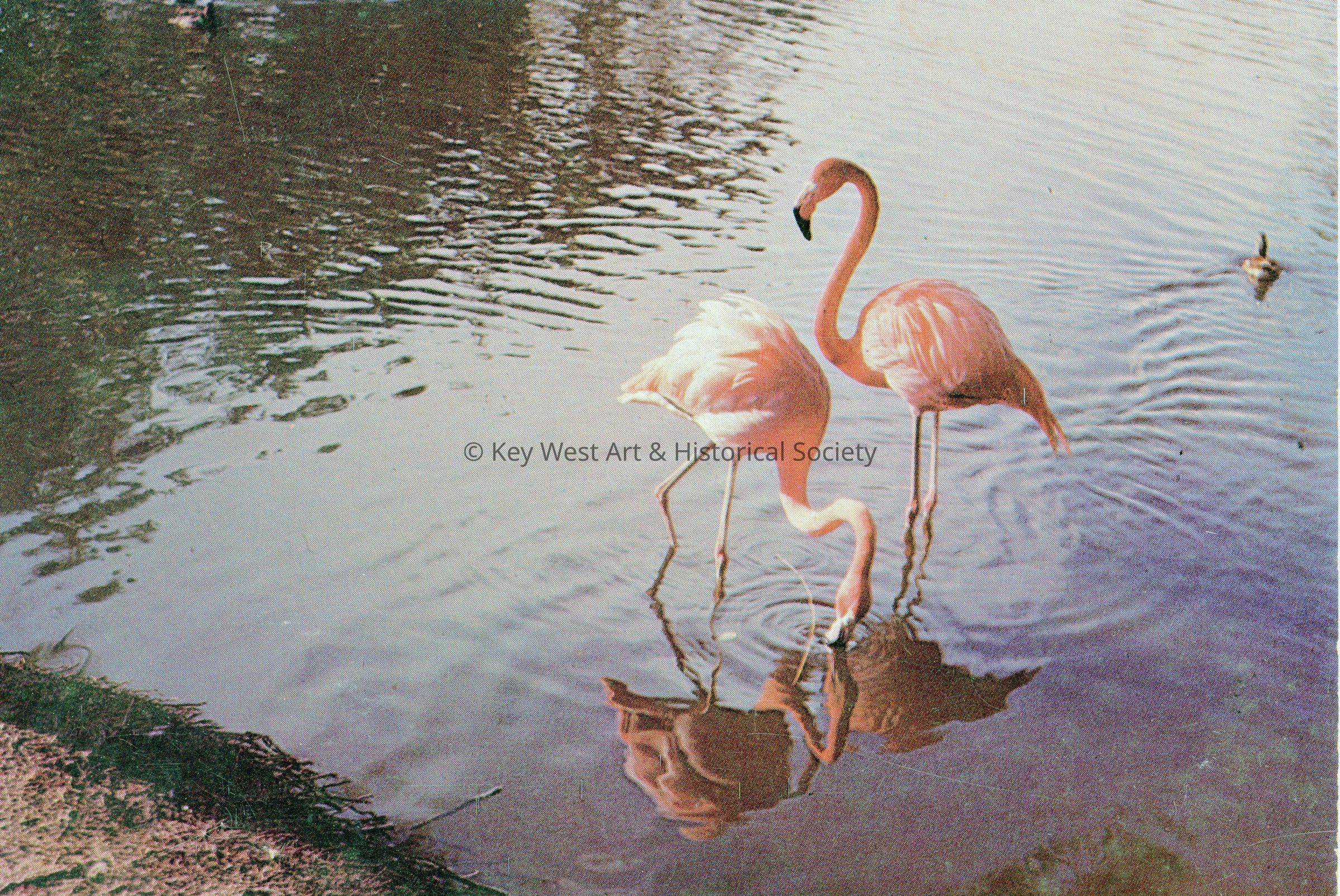 Postcard depicting two flamingos standing in an unidentified body of water.