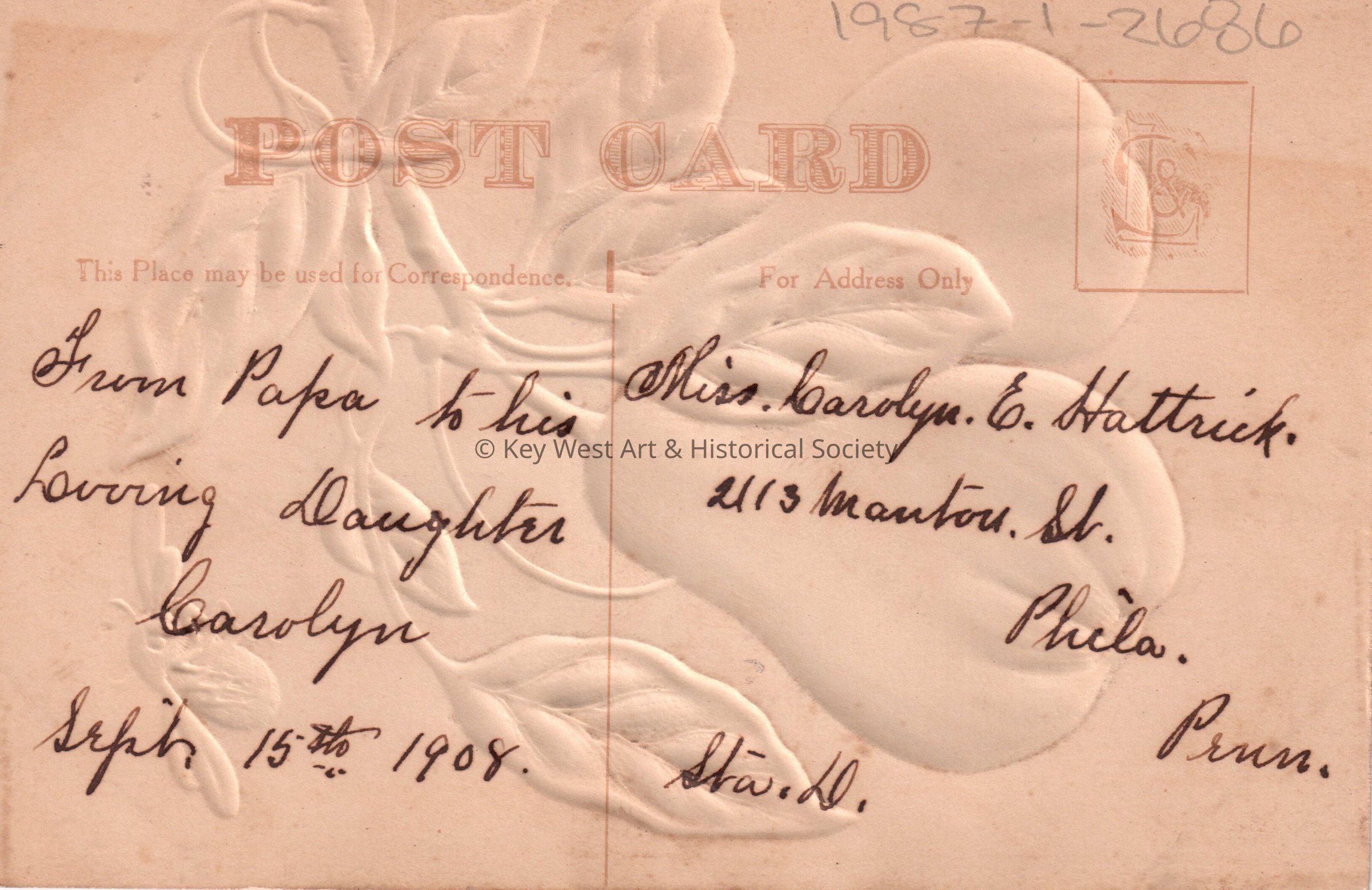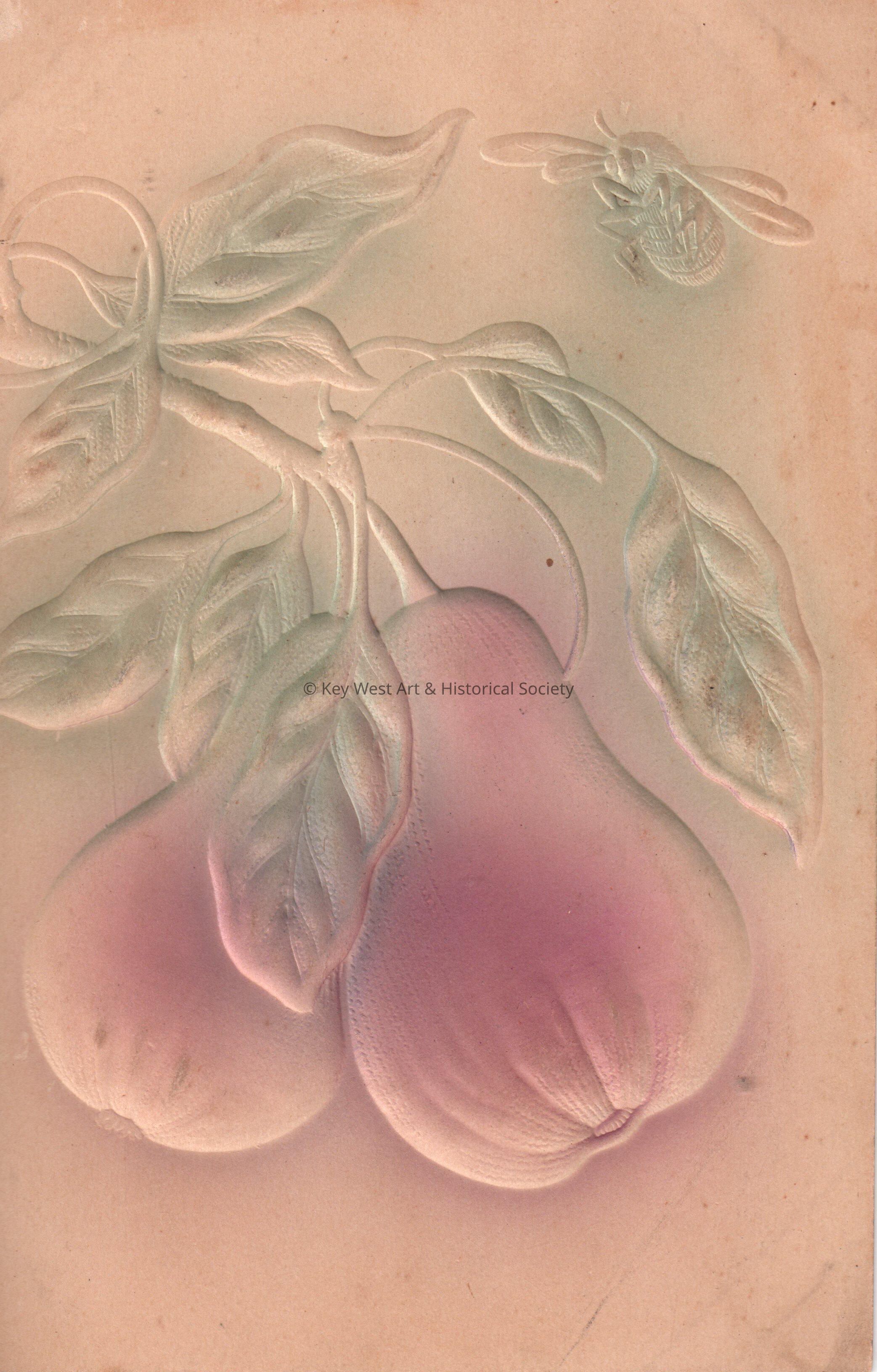 Postcard depicting a bee near a branch of pears. The message on the verso reads, ‘From Papa to his loving daughter Carolyn September 15th, 1908’. The card is addressed to Miss Carolyn E. Hattrick, 2113 Manton Street, Station D, Philadelphia, Pennsylvania.Collection
