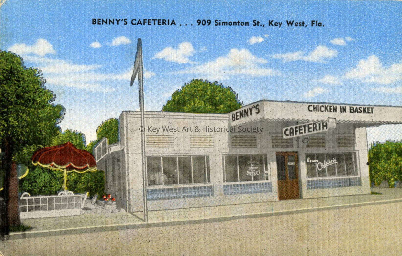 Postcard depicting Benny's Cafeteria. The caption reads, ‘Benny’s Cafeteria, 909 Simonton Street, Key West, Florida’. The description on the verso reads, 'Benny's Cafeteria, 909 Simonton Street, Key West, Florida. Benny's original Key Lime Pie Recipe. Combine 4 egg yolks, 3 ounces Lime Juice and one can Condensed Milk. Pour into Baked Pie Crust and add meringue top. Bake till meringue is brown.'Subject Place