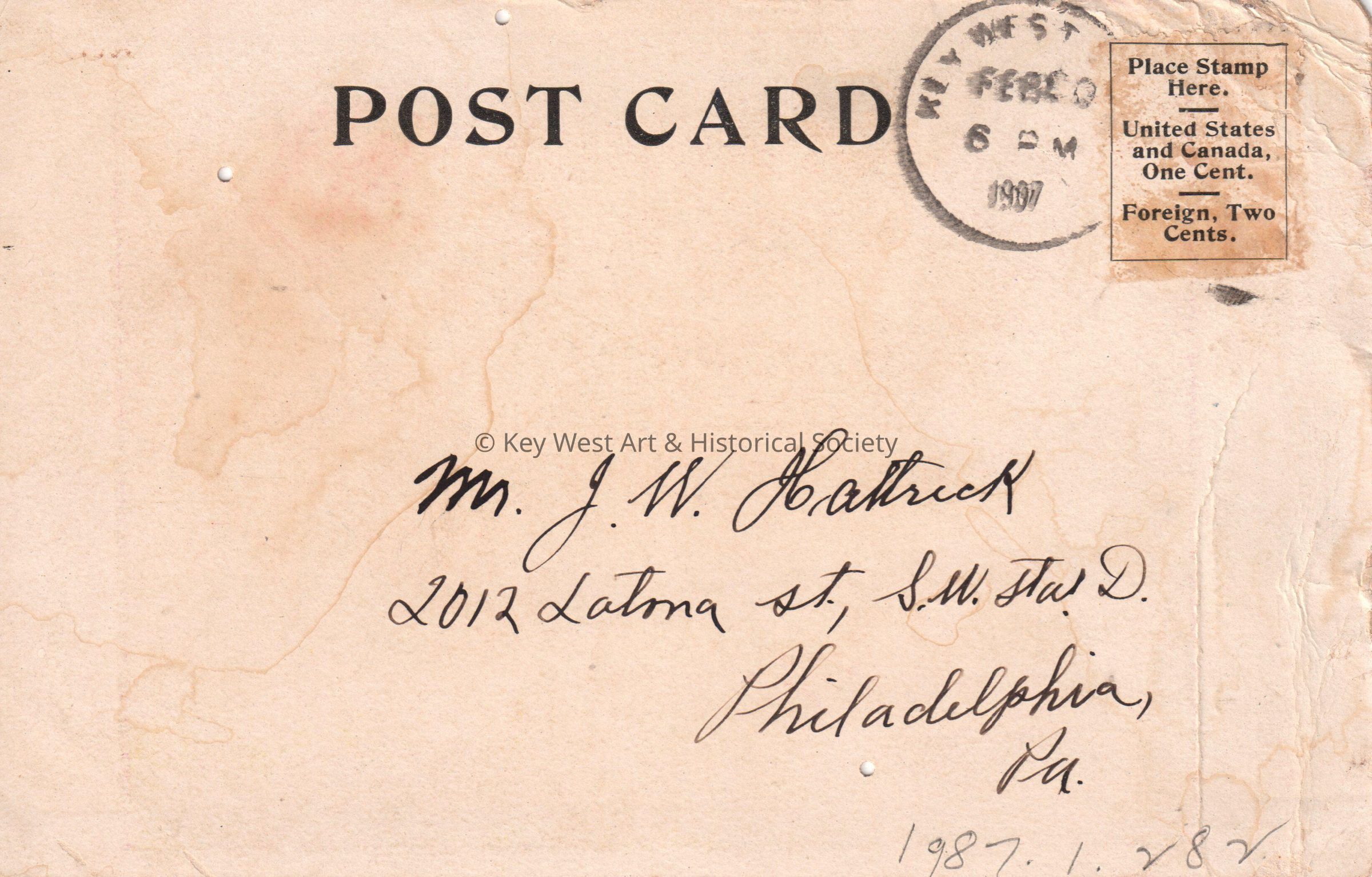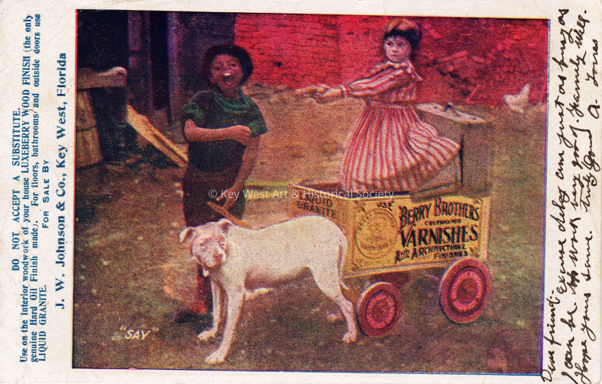 Postcard depicting children and a dog with a cart that contains an advertisement that reads, ‘Use Berry Brothers celebrated varnishes and architectural finishes.’ The caption reads, ‘Say’. An advertisement on the front of the card reads, ‘Do not accept a substitute. Use on the interior woodwork of your house Luxeberry wood finish (the only genuine hard oil finish made). For floors, bathrooms, and outside doors use liquid granite. For sale by J. W. Johnson Company, Key West, Florida.’ A message on the front of the card reads, ‘Dear friend, excuse delay am just as busy as can be. Work very good. Family well. Hope yours same. Truly yours, A. Torres’. The card is addressed to Mr. J.W. Hattrick, 2012 Latona Street, Philadelphia, Pennsylvania, Southwest Station D, and is postmarked Key West, February 20, 1907.Collection