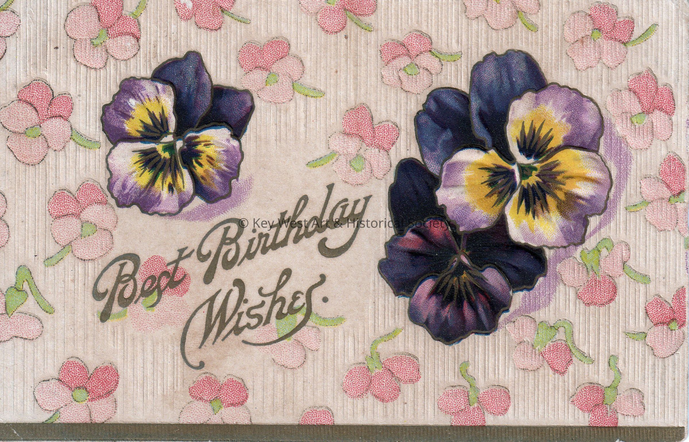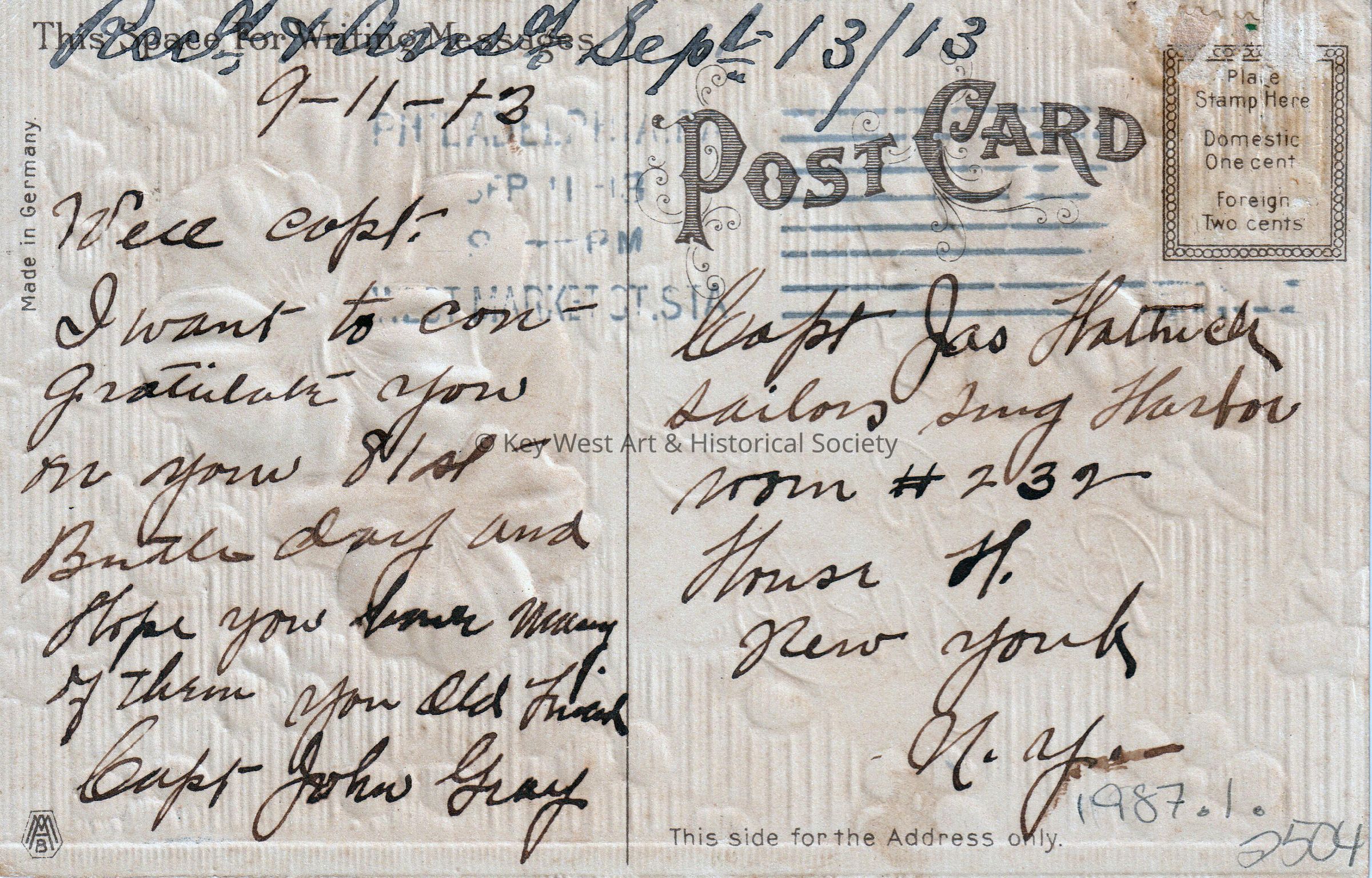 Postcard depicting pansies. The caption reads, ‘Best Birthday Wishes.’ The message on the verso reads, ‘September 11, 1913, Well, Captain, I want to congratulate you on your 81st Birthday and hope you have many of them. Your Old Friend, Captain John Gray.’ The card is addressed to Captain James Hattrick, Sailors Snug Harbor, Room #237, House H, New York, New York. Note on the verso reads, ‘Received and answered September 13, 1913.’ The card is postmarked West Market QT Sta, September 11, 1913.Collection