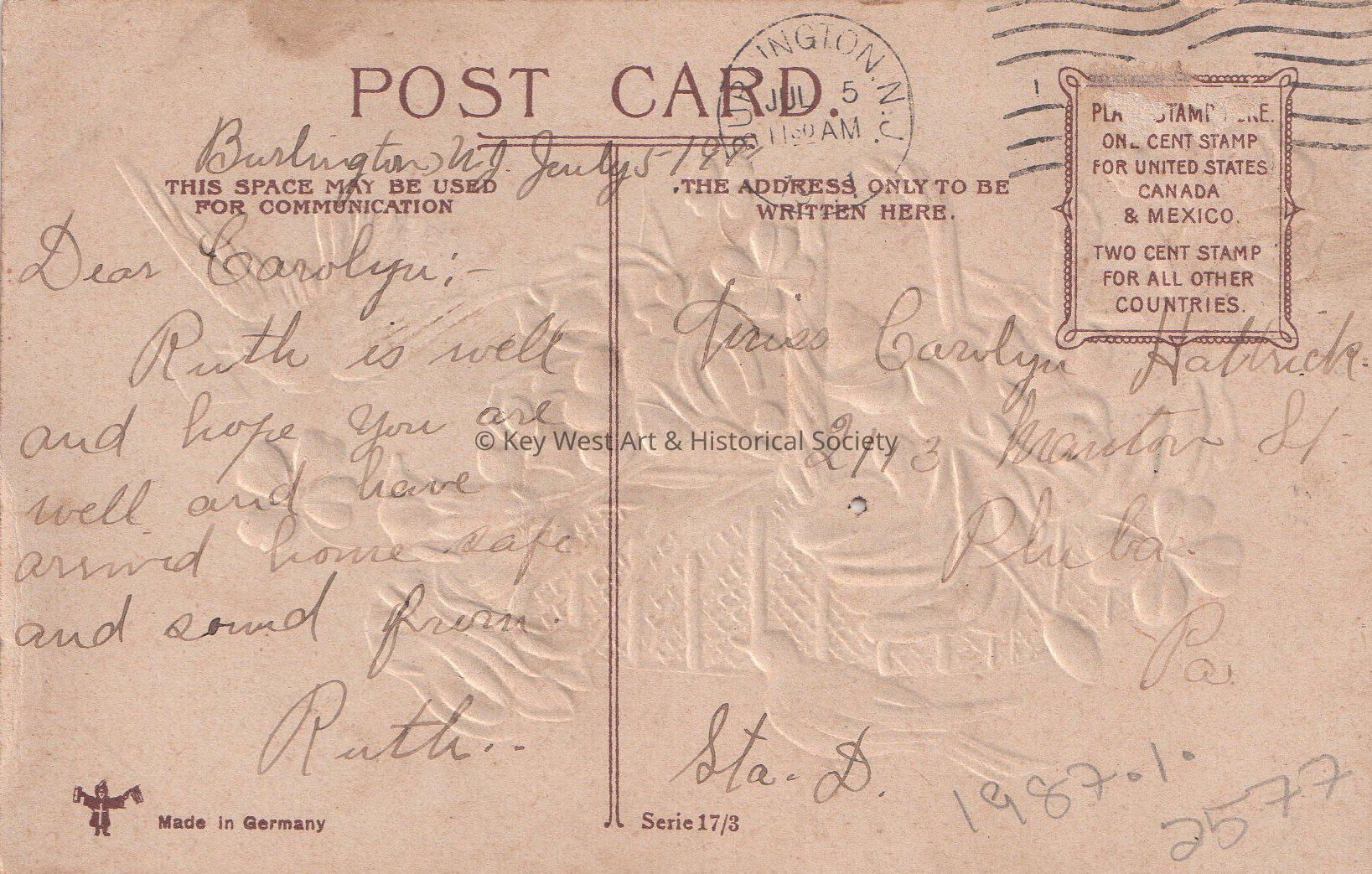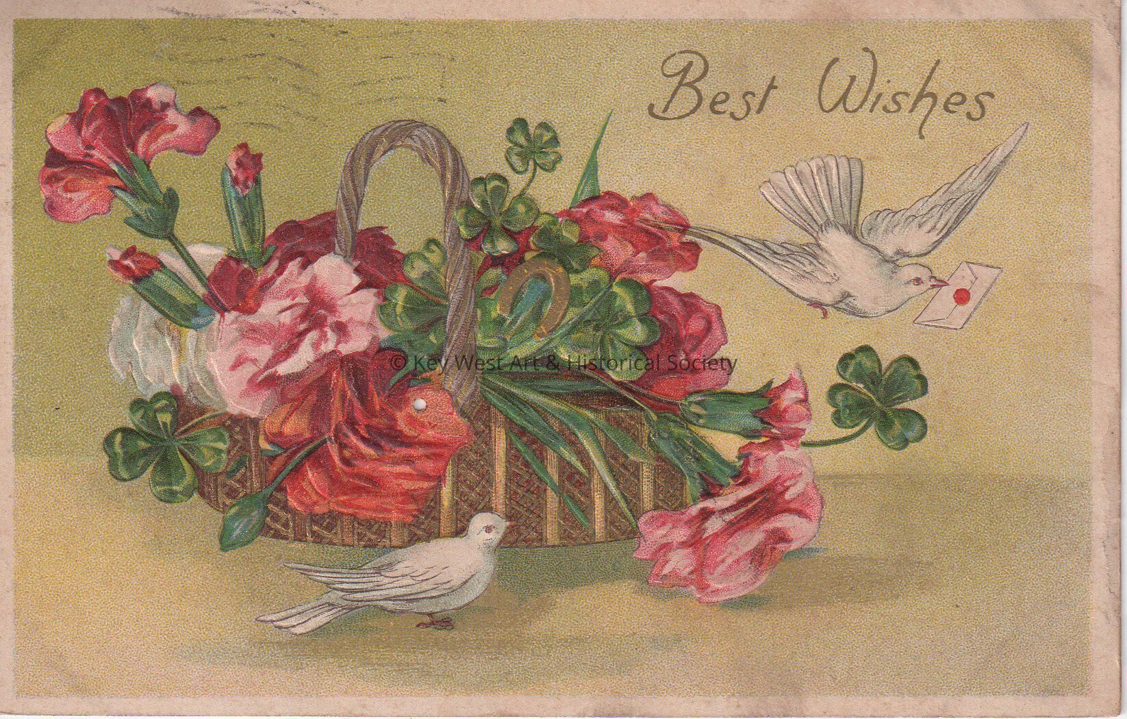 Postcard depicting doves with a card near a basket of flowers and shamrocks. The caption reads, ‘Best Wishes’. The message on the verso reads, ‘Burlington, New Jersey, July 5, 1911, Dear Carolyn, Ruth is well and hope you are well and have arrived home safe and sound. From, Ruth.’ The card is addressed to Miss Carolyn Hattrick, 2113 Manton Street, Philadelphia, Pennsylvania, Station D, and is postmarked Burlington, New Jersey, July 5.