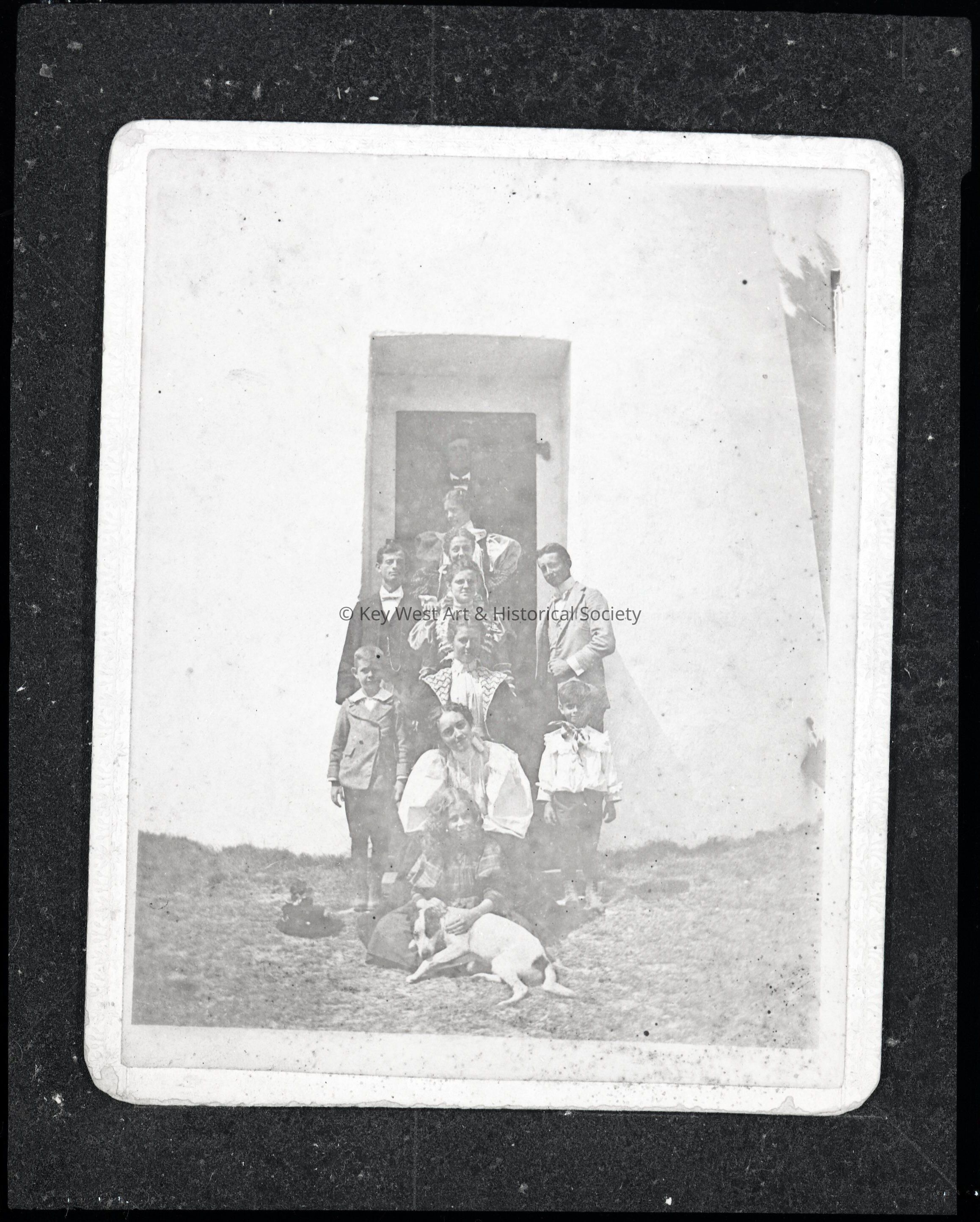 Black and white negative of eleven members of the Bethel family posing at the base of the Key West Lighthouse.