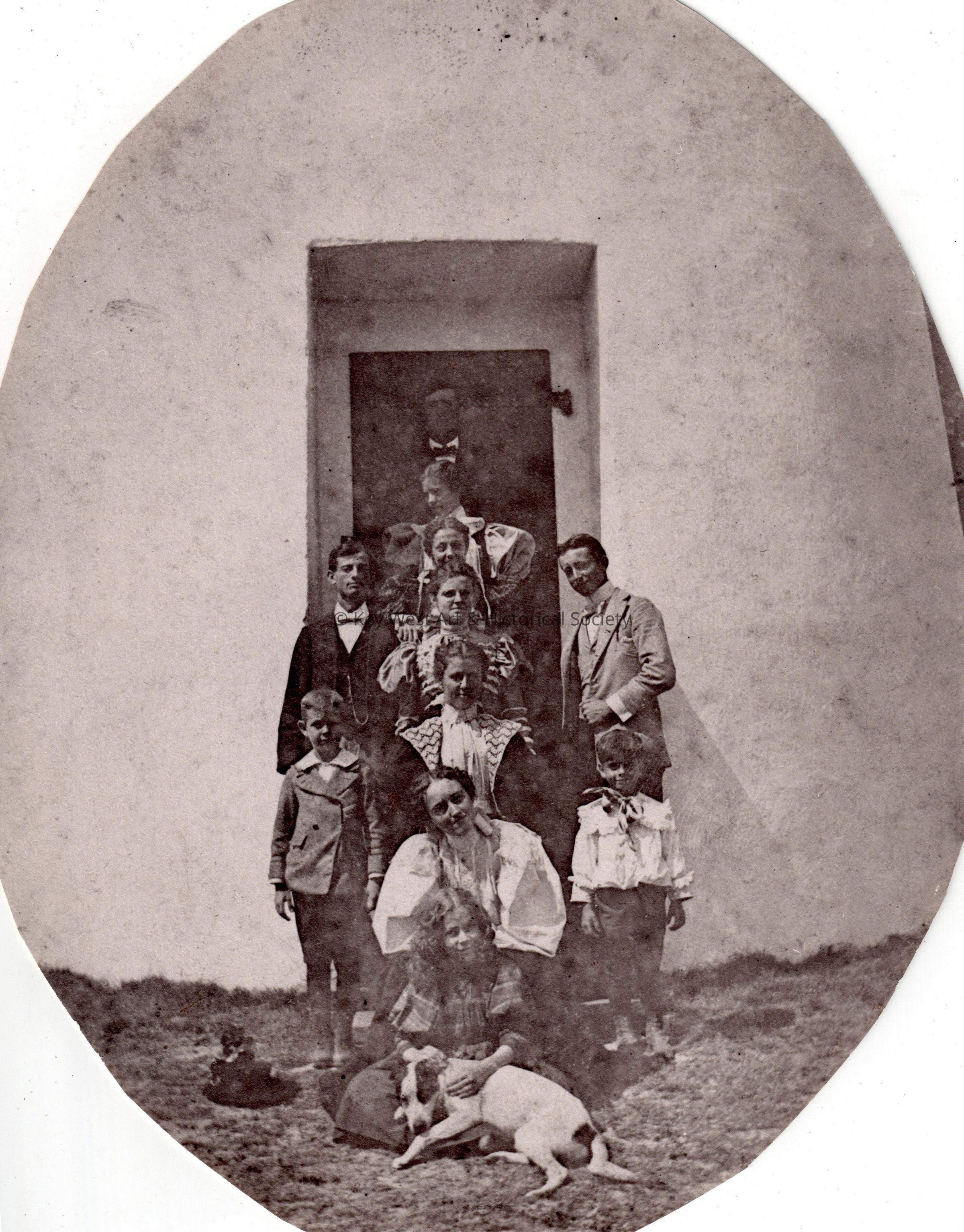Black and white photograph of eleven members of the Bethel family posing at the base of the Key West Lighthouse.