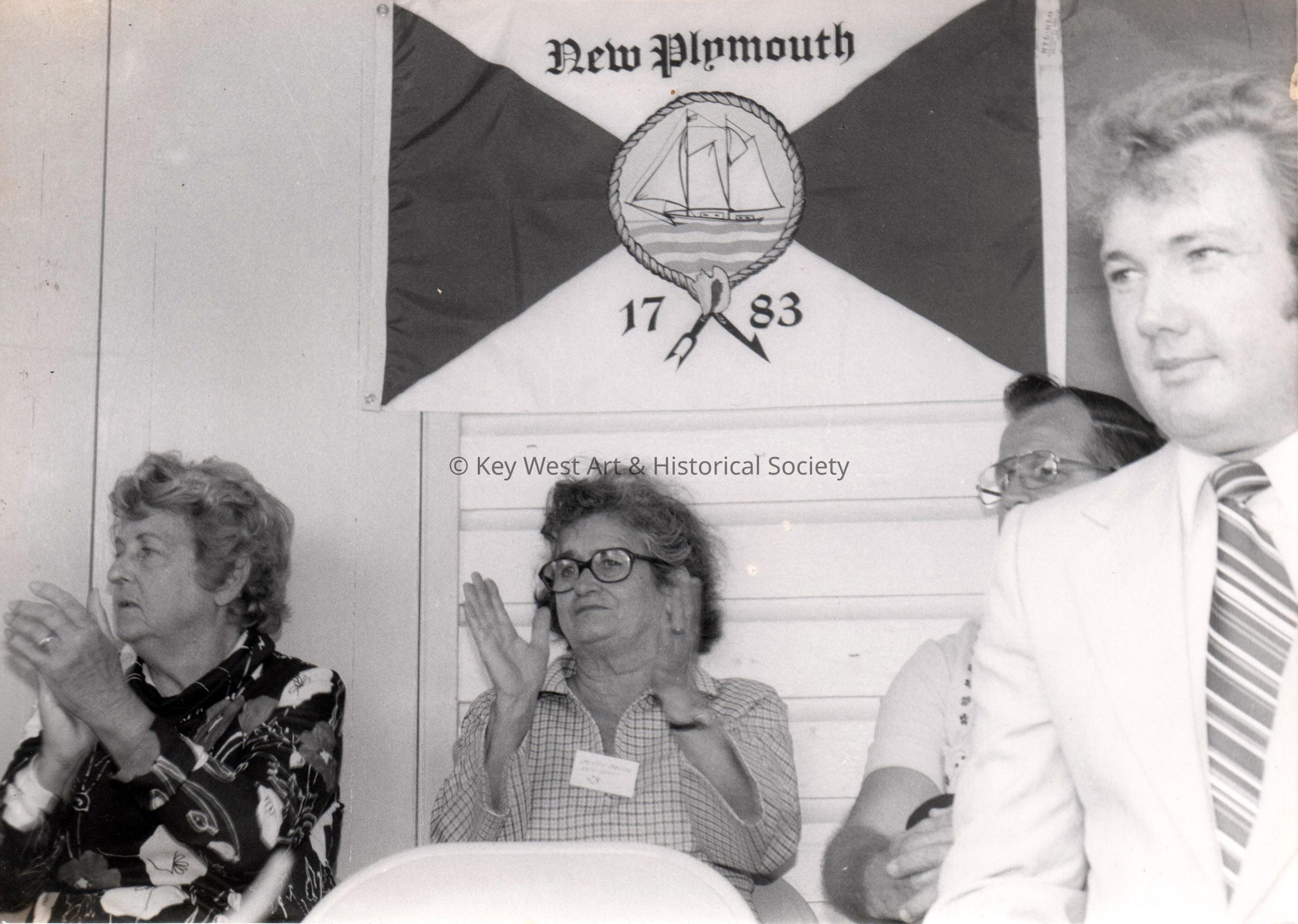 Black and white photograph of Betty Bruce (second from left) and Alton Lowe (right) in front of a New Plymouth, 1783 flag.Photograph Details