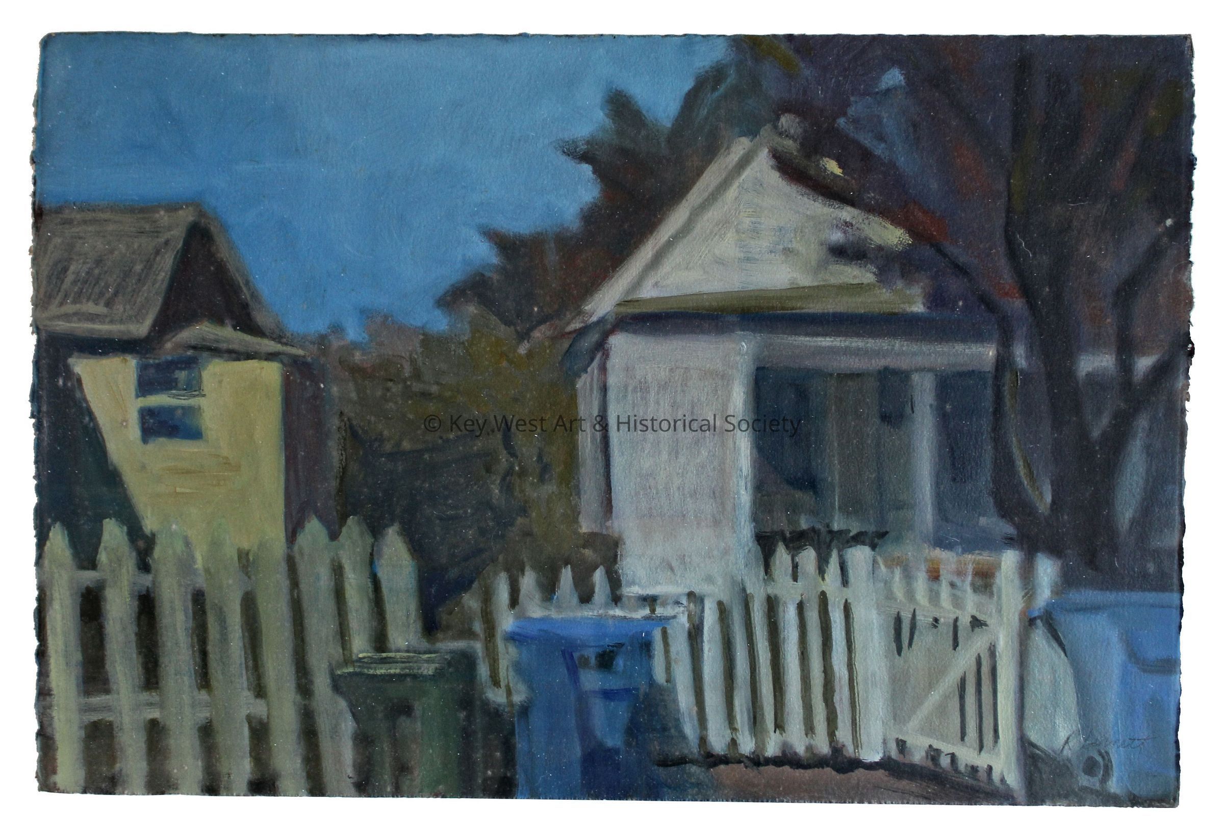 Oil on Arches cold pressed oil paper by Rebecca Bennett depicting a residential scene, capturing two quaint houses on Julia Street. The painting's name 'Between,' indicates the community and connection between homes in Bahama Village, including the fencing, trash pick up and trees.