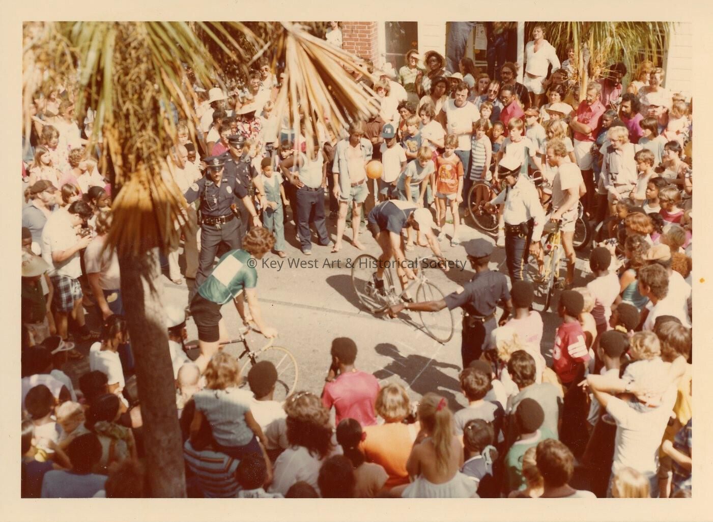 Color photograph of bike riders surrounded by a crowd. Possibly taken during the Island Roots Festival in Key West