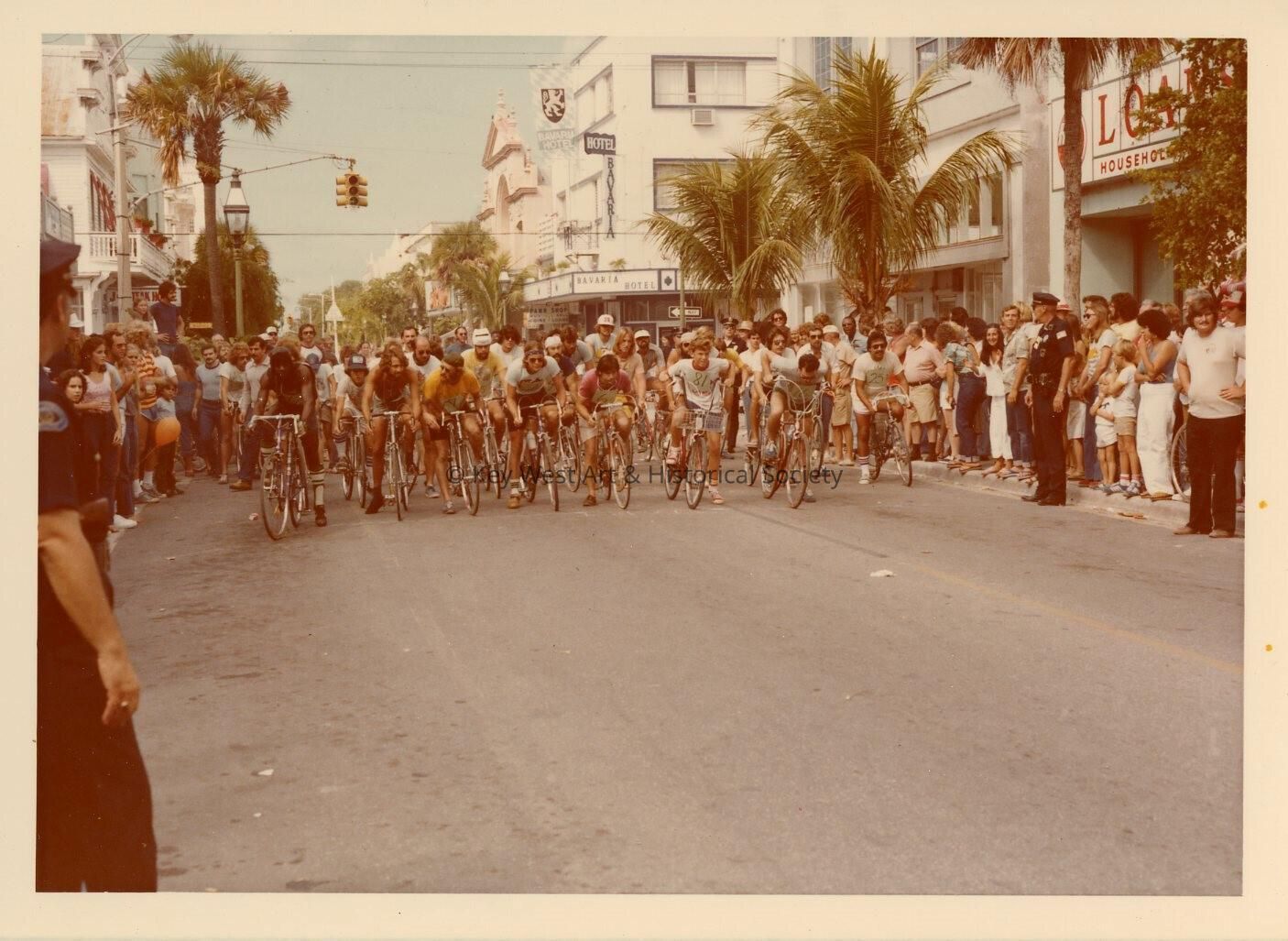 Color photograph of bike riders on the 600 block of Duval Street, possibly a race. The Bavaria Hotel is seen in the background.Collection
