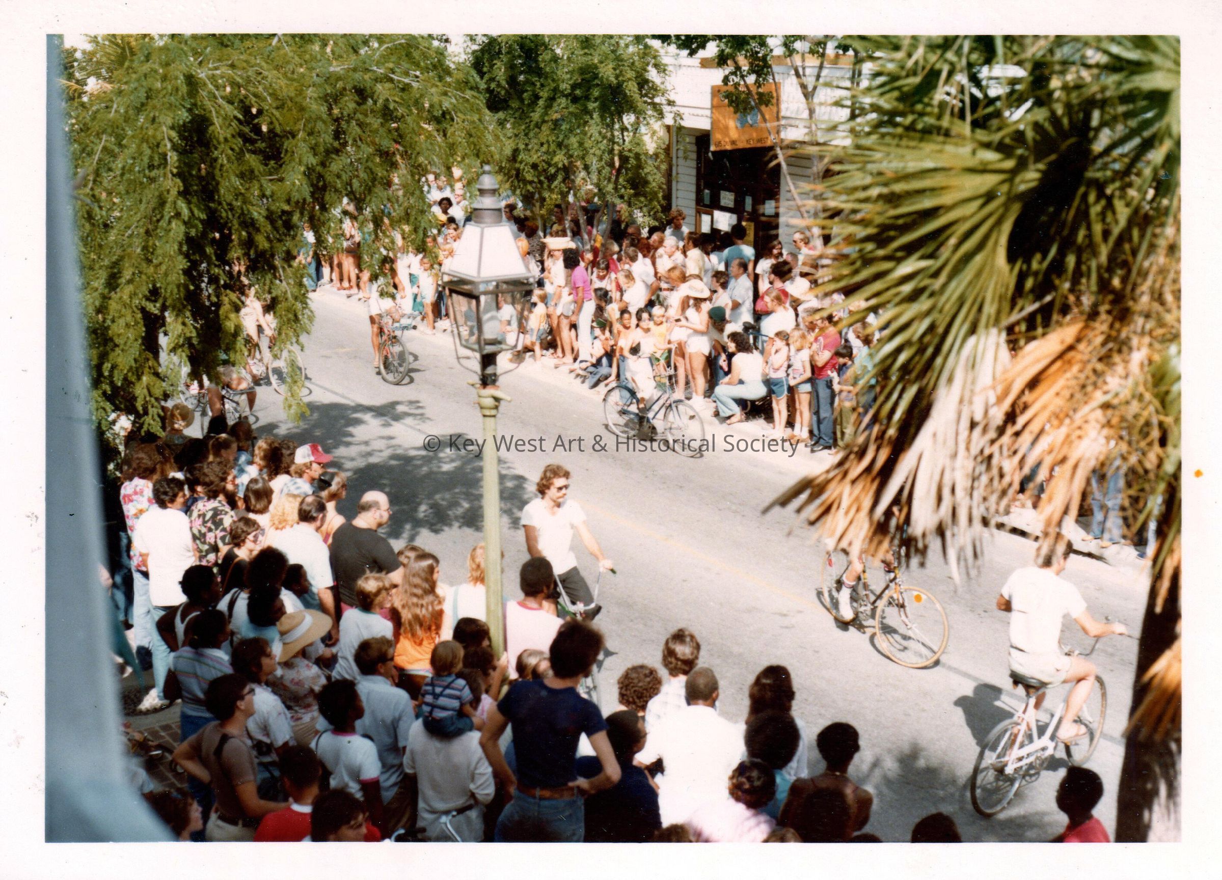 Color photograph of bicycles on Duval Street, possibly during the Island Roots Festival.