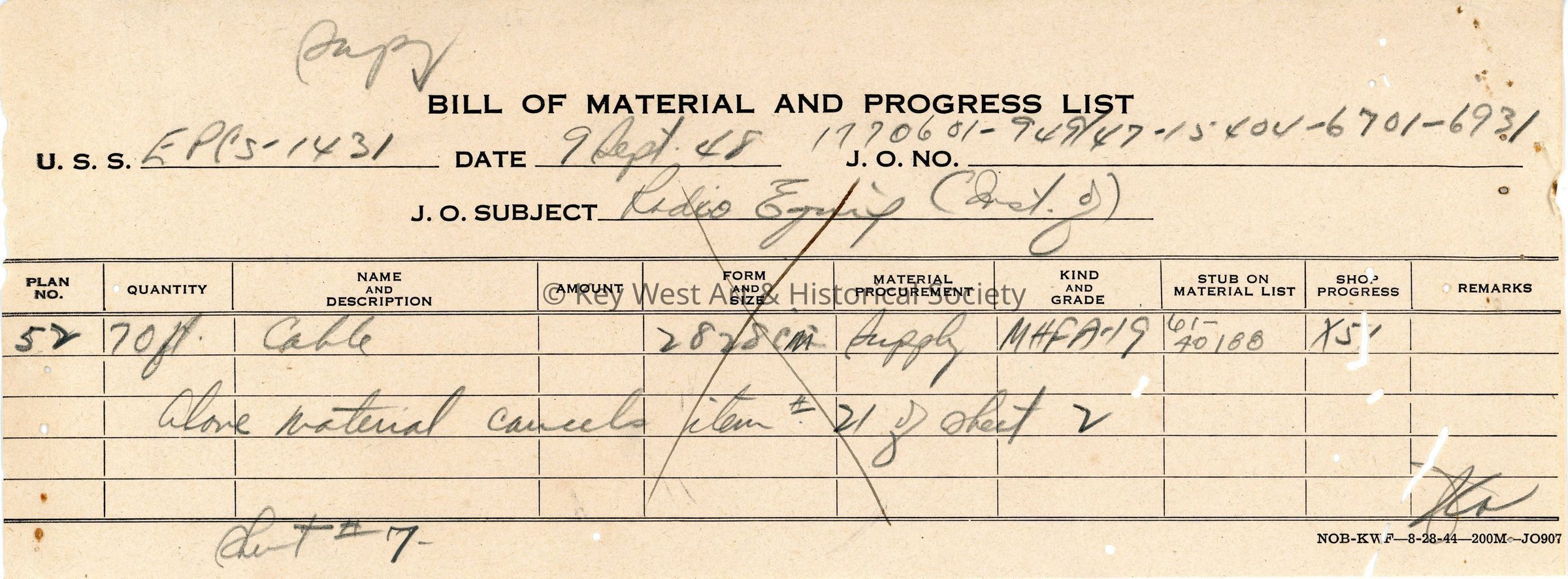 List and description of materials used in the installation of MAR/RDR radio equipment on the USS EPCS-1431 at Naval Station Key West. Page 7/8.