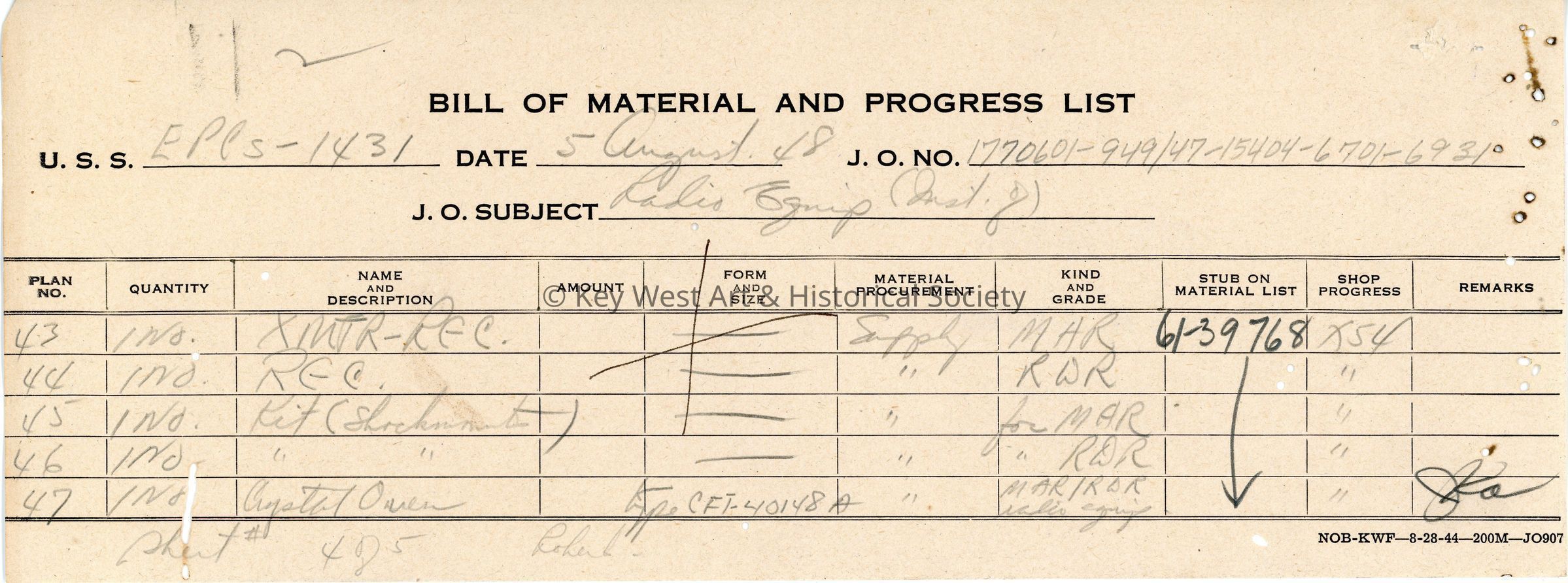 List and description of materials used in the installation of MAR/RDR radio equipment on the USS EPCS-1431 at Naval Station Key West. Page 4/5.