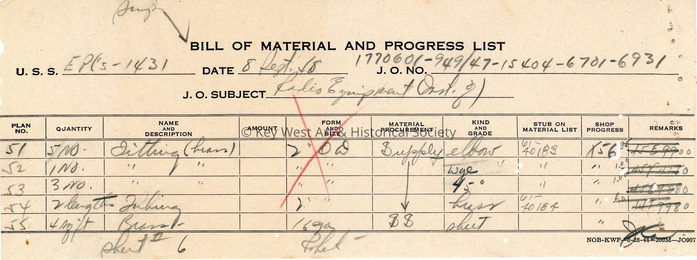 Bill of Material and Progress List: © Key West Art & Historical Society