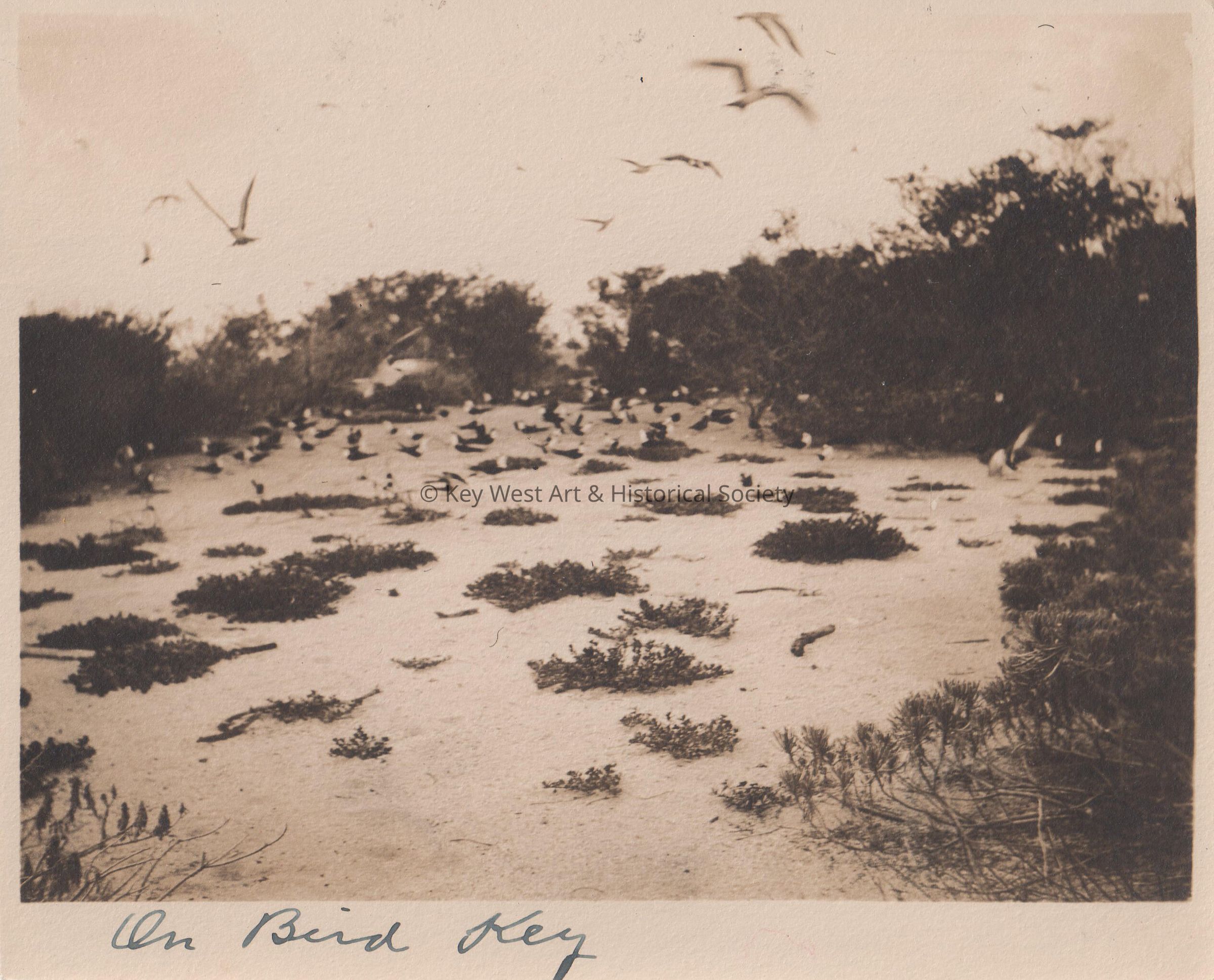 Black and white photo taken on Bird Key in the Dry Tortugas. Image shows birds on the ground and flying. Caption reads 'On Bird Key'.