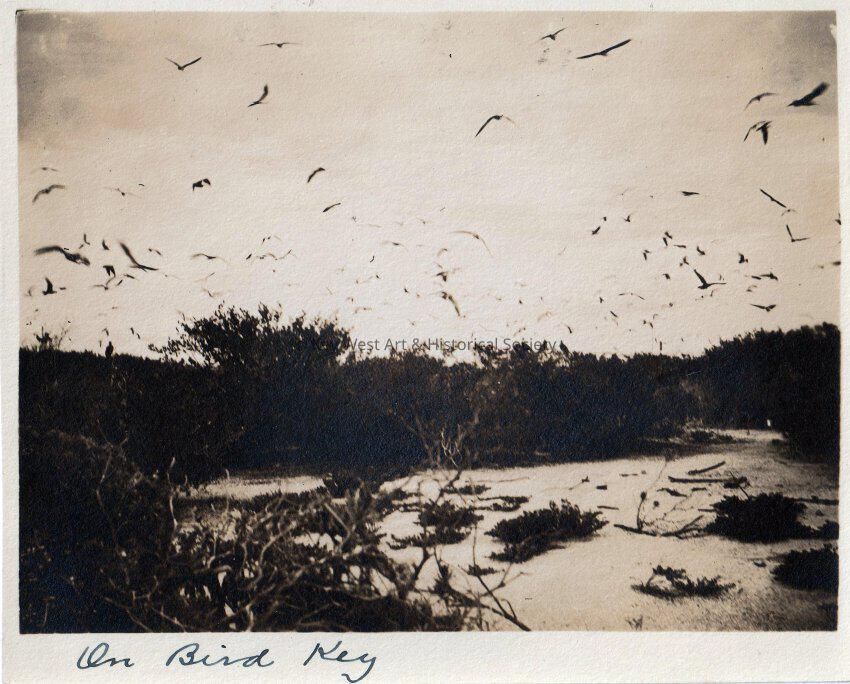 Black and white photo taken on Bird Key in the Dry Tortugas. Image shows birds in the air. Caption reads, 'On Bird Key'.
