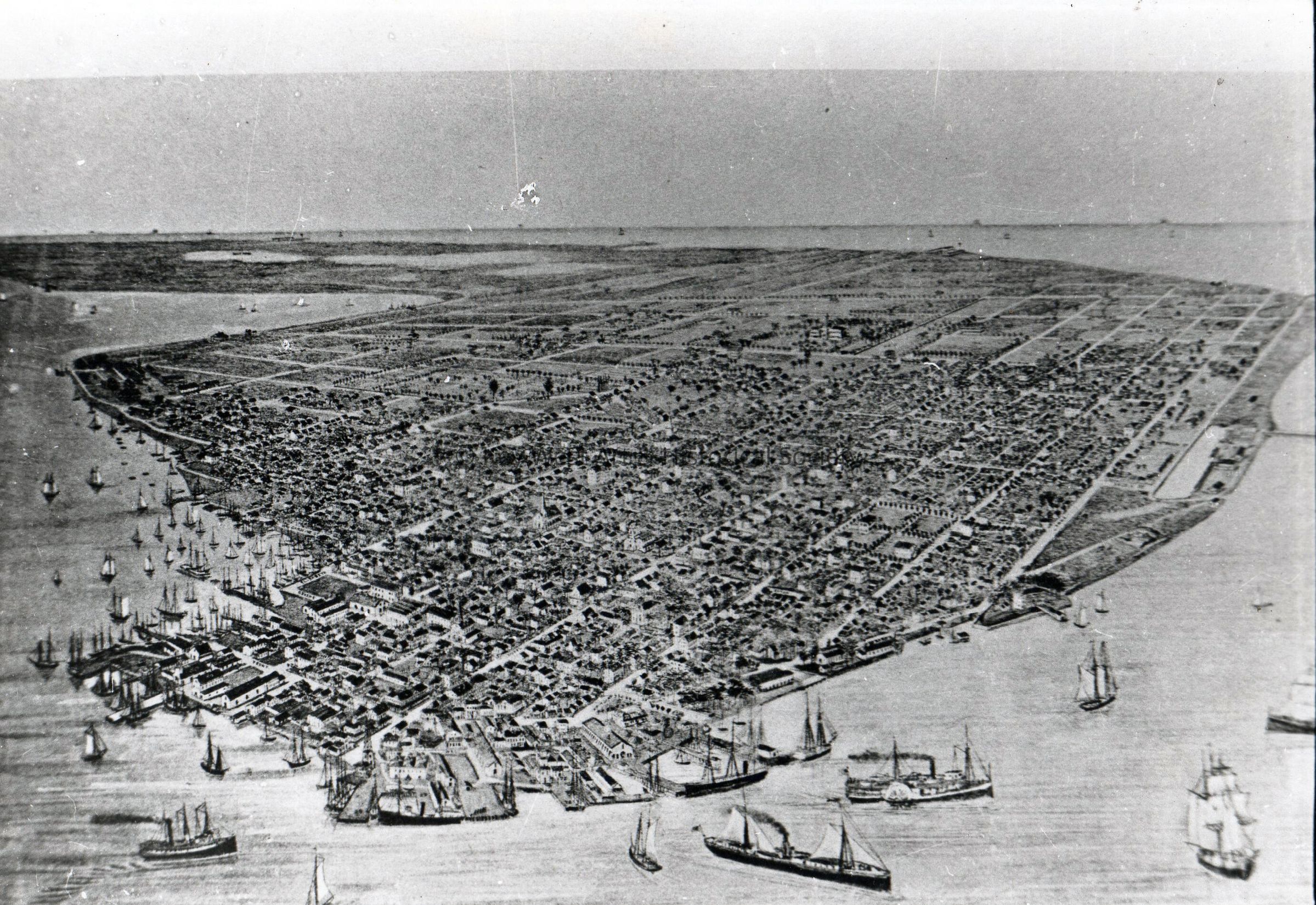 Black and white photograph of a bird's eye view map created by the C.S. Monroe Co.