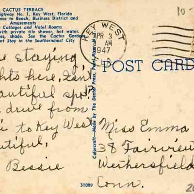 Postcard depicting a Birdseye View Cactus Terrace, Key West, Florida.Collection