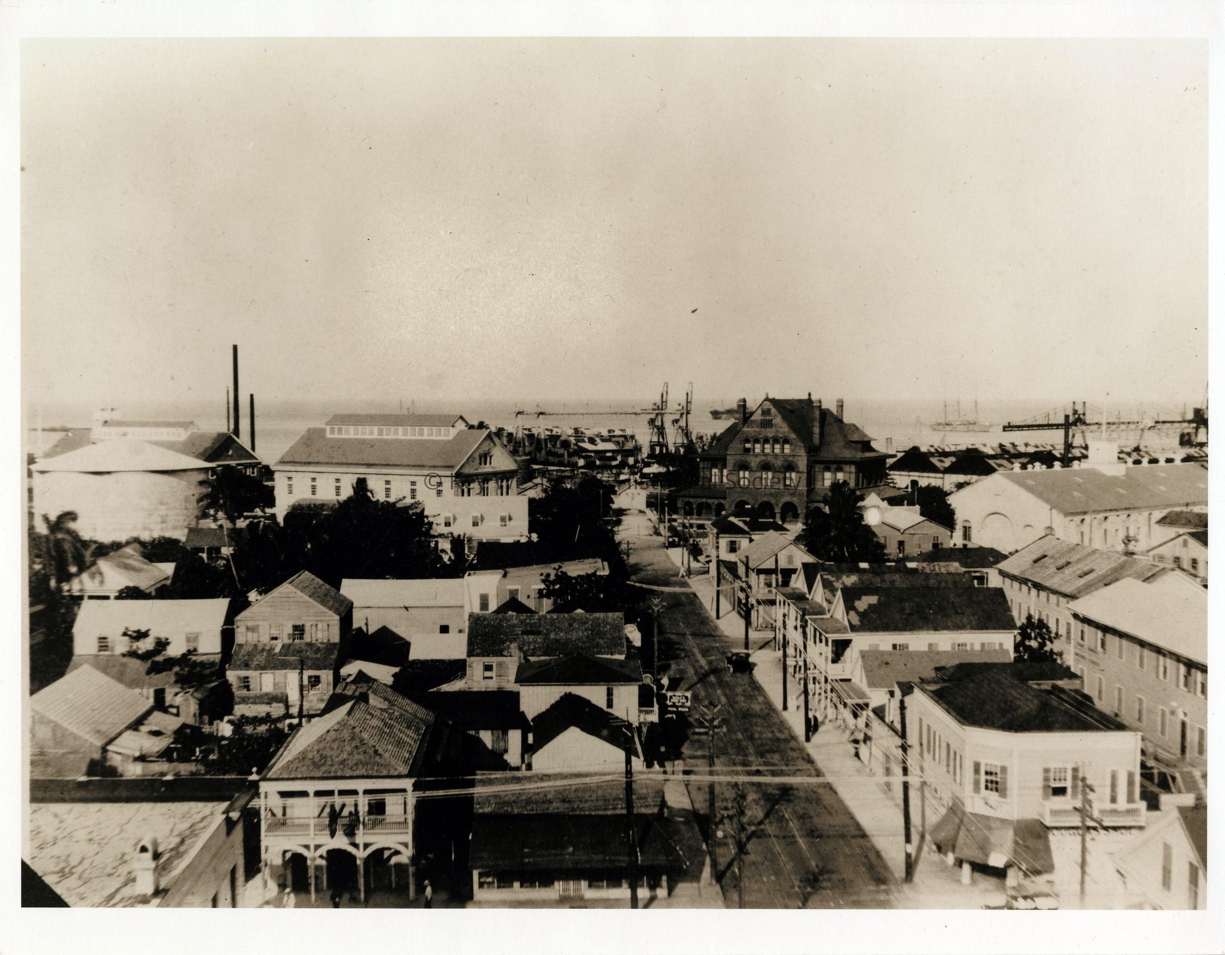Black and white birdseye view photograph looking west down Greene Street from the corner of Duval Street. The Custom House and Post Office visible near the waterfront.