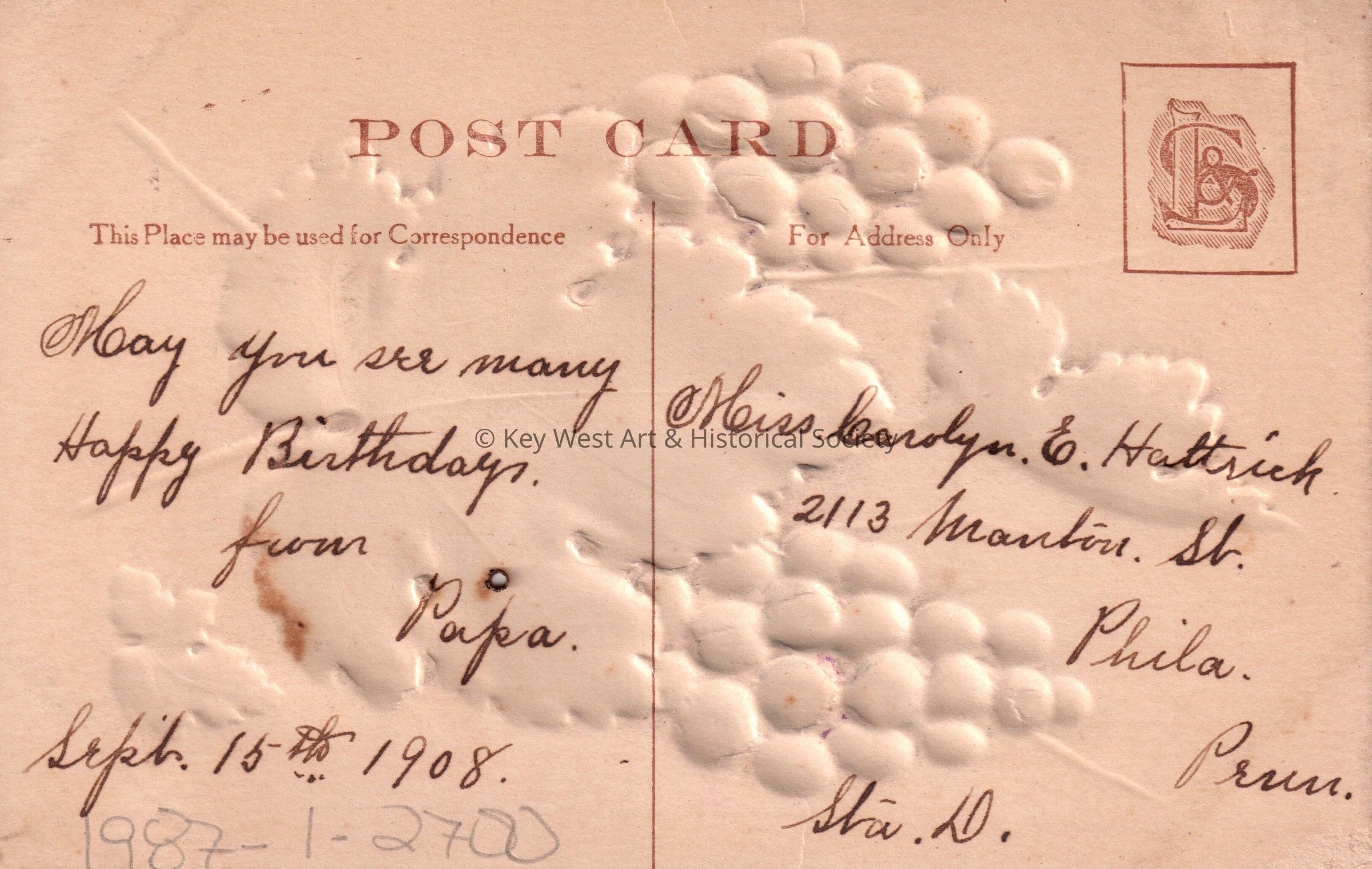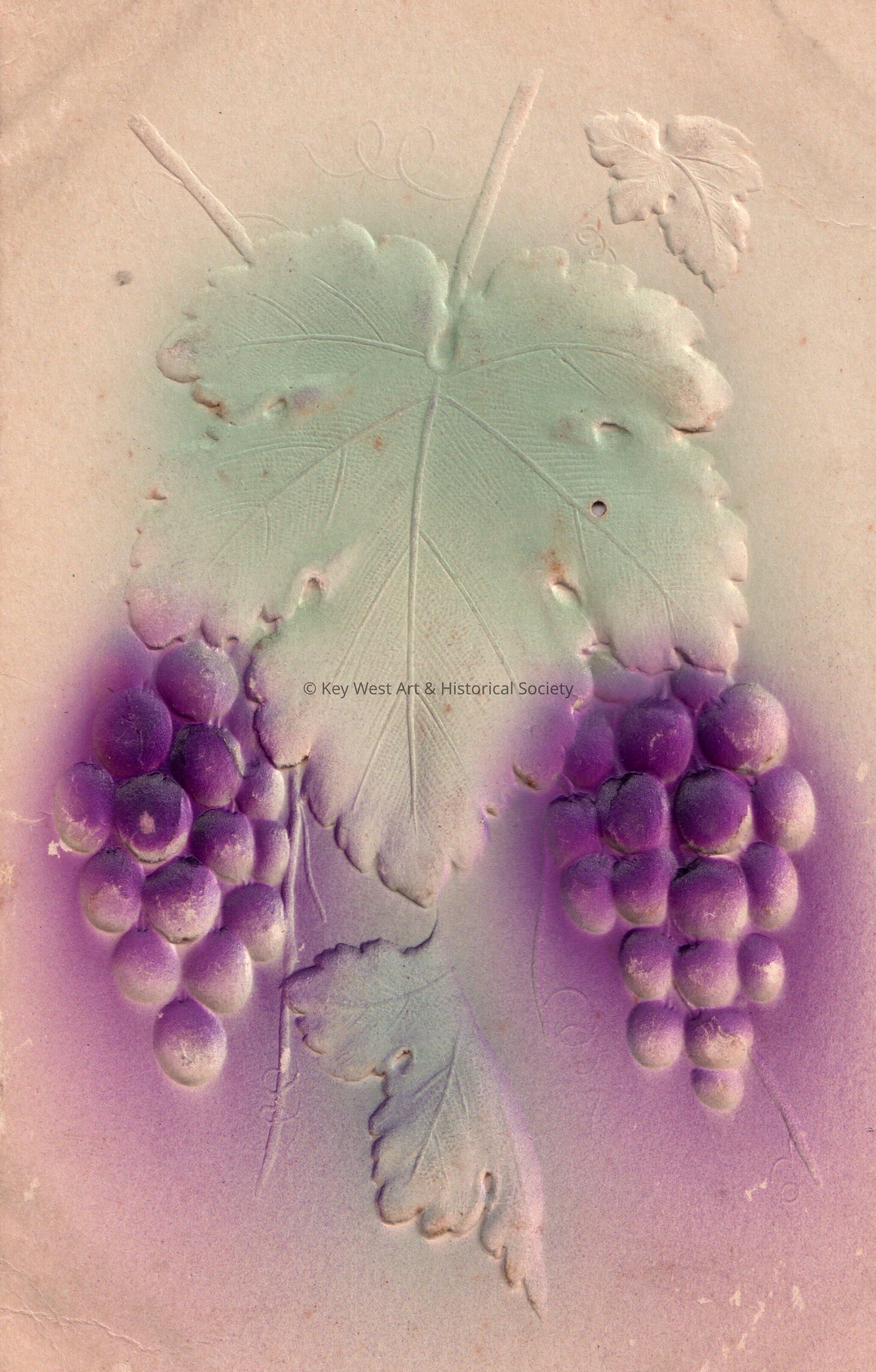 Postcard depicting grapes and leaves. The message on the verso reads, ‘May you see many Happy Birthdays, from Papa, September 15th, 1908’. The card is addressed to Miss Carolyn E. Hattrick, 2113 Manton Street, Station D, Philadelphia, Pennsylvania.Collection